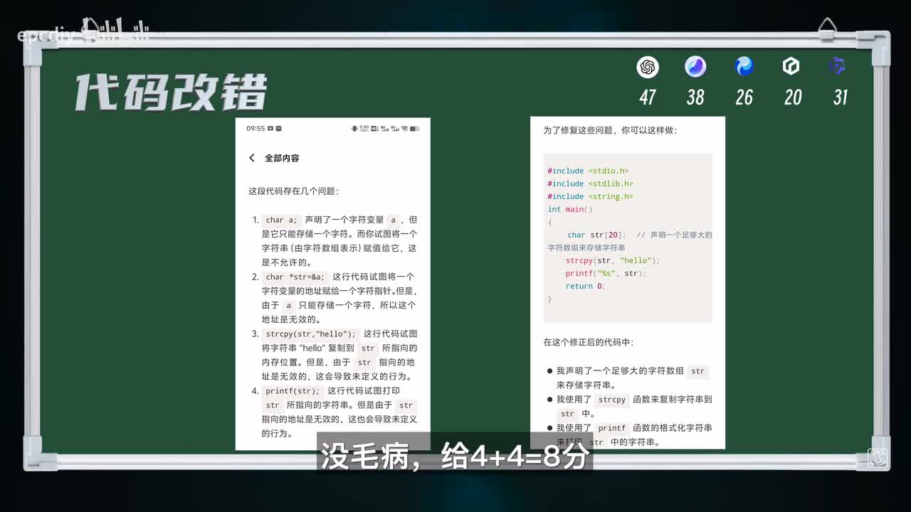 分分第一题代码改错评分标准,找到所有的错误分找找或者是是找到一项扣一分。如果写写错错误代码,按照代码的质量进行打分,最高分蓝蓝的回答找找到了四个错误。复代码中规中矩没毛病,病四四四四八分,但由于预分配的内存太多了,不能满分。分分找到了四个错误,错误的代码的内存利用也分,但是l l s t r等于a多此一举找找四等于八十分,到了两个错误。它的修正代码采用了动态分配,而且做了空指针判断二加六等于八分。