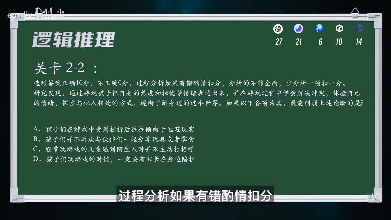 在游戏过程中学会解决冲突,体验自己的情绪,探索与他人相处的方式,逐渐了解身边这个世界。如果以下各项为真,最能削弱上述论断的是,a孩子们在游戏中遭受到了挫折后,往往倾向于逃避现实。b孩子们并不喜欢与伙伴一起分享玩具或者零食c经常玩游戏的儿童遇到陌生人并不会主动打招呼b孩子们玩游戏的时候,一定有家长在在身边陪护。文心的回答正确,并且每个选项都做了分析,十分兰心的回答也简单易懂,也正确,但解释过于简单了,七分。混源回答正确,这次火源终于简单了,十分chat g p t的回答也不错,十分,通义千问的回答也是正确的,但解释过于简单了,七分。