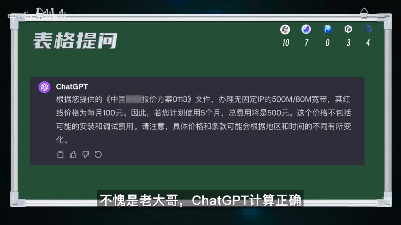 混元是不支持p d f解读啊,零分。第二题,接下来是表格总结,我会给他上传一张某企业宽带计费表格,针对表格提问,请问如果我要办理无固定ip的五百兆下行,八十兆上行的宽带,红线价五个月多少钱?评分标准正确计算宽带费八分,提到隐藏均速安装费的两分,不愧是老大哥,他的g p t计算正确,又考虑到了安装费,所以我给他十分,计算上是没问题,确实是一百乘以五等于五百,但他忽略了一个安装费啊,八分。文心没有正确读取红线价,而是读了原价,所以答案错误,零分。通义千问甚至连价格在哪一行都读错了,零分。由于混源不支持读取文件,所以本轮也是零分。