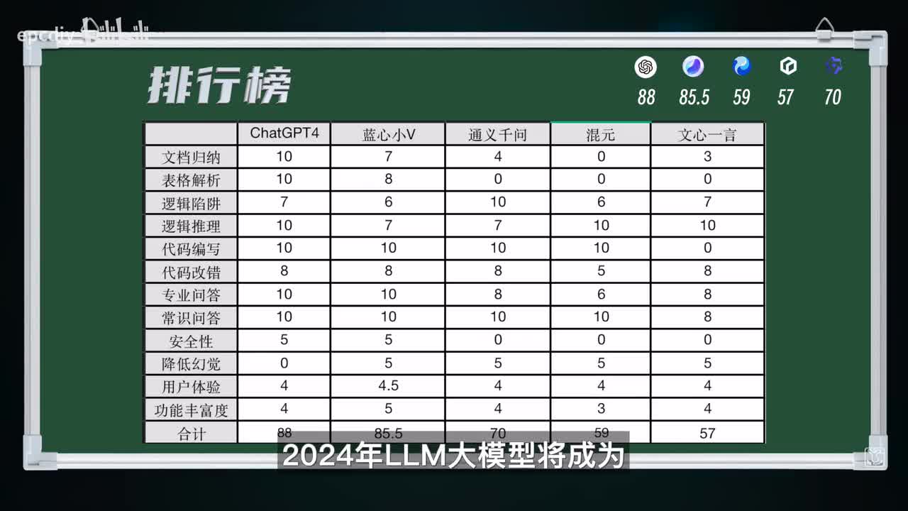 五分文心通义千问一定程度对标chat g p t,他们三者我觉得可以并列四分,而火源缺乏p d f文档解析能力,只能得三分。好了,我们来看看最终的排行榜吧,总结。随着a i领域的发展,二零二四年l l m大模型即将成为所有终端以及互联网厂商竞争的核心之一。无论号称多少多少亿参数,还是要看实际表现。我觉得能在手机端取得最佳的用户体验也是很重要的因素之一。