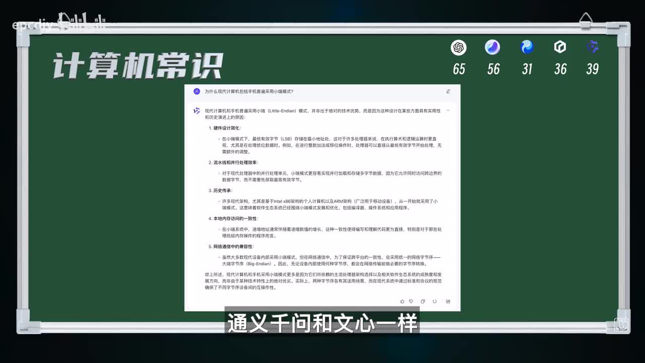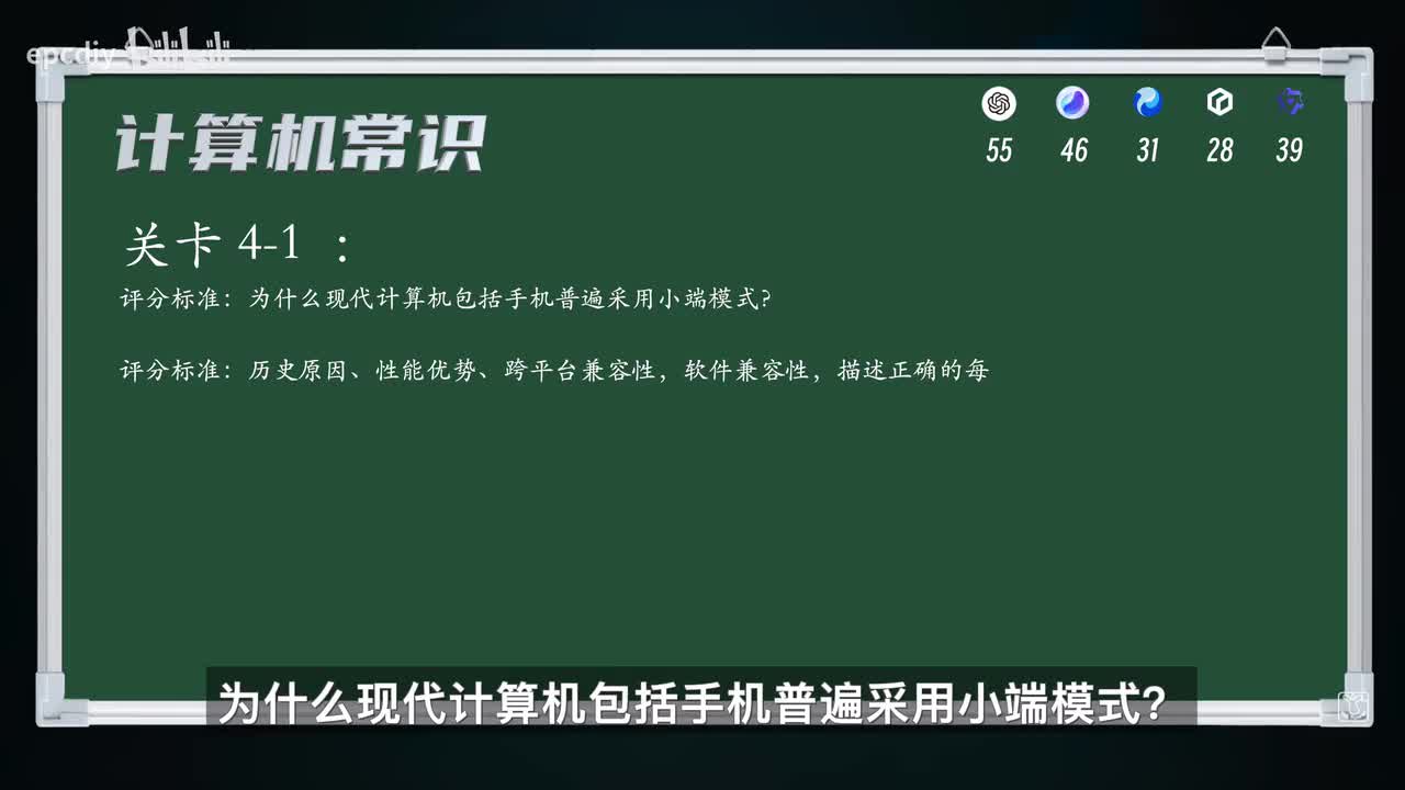 g p t找到了两个问题,并给出两种修改方法。二加六等于八分,混匀也找到了两个问题,而代码中chair新s t r等于a多此一举,二加三等于五分。第四关常识问答二十分,包含专业领域计算机领域日常常识。第一题,为什么现在计算机包括手机普遍采用小端模式?这正好和我之前的视频做过的内容一致啊,我就斗胆按照我的视频内容作为标准答案吧。评分标准,历史原因,性能优势,跨平台兼容性软件兼容性描述正确的每项加两分,无其他废话的内容再加两分。