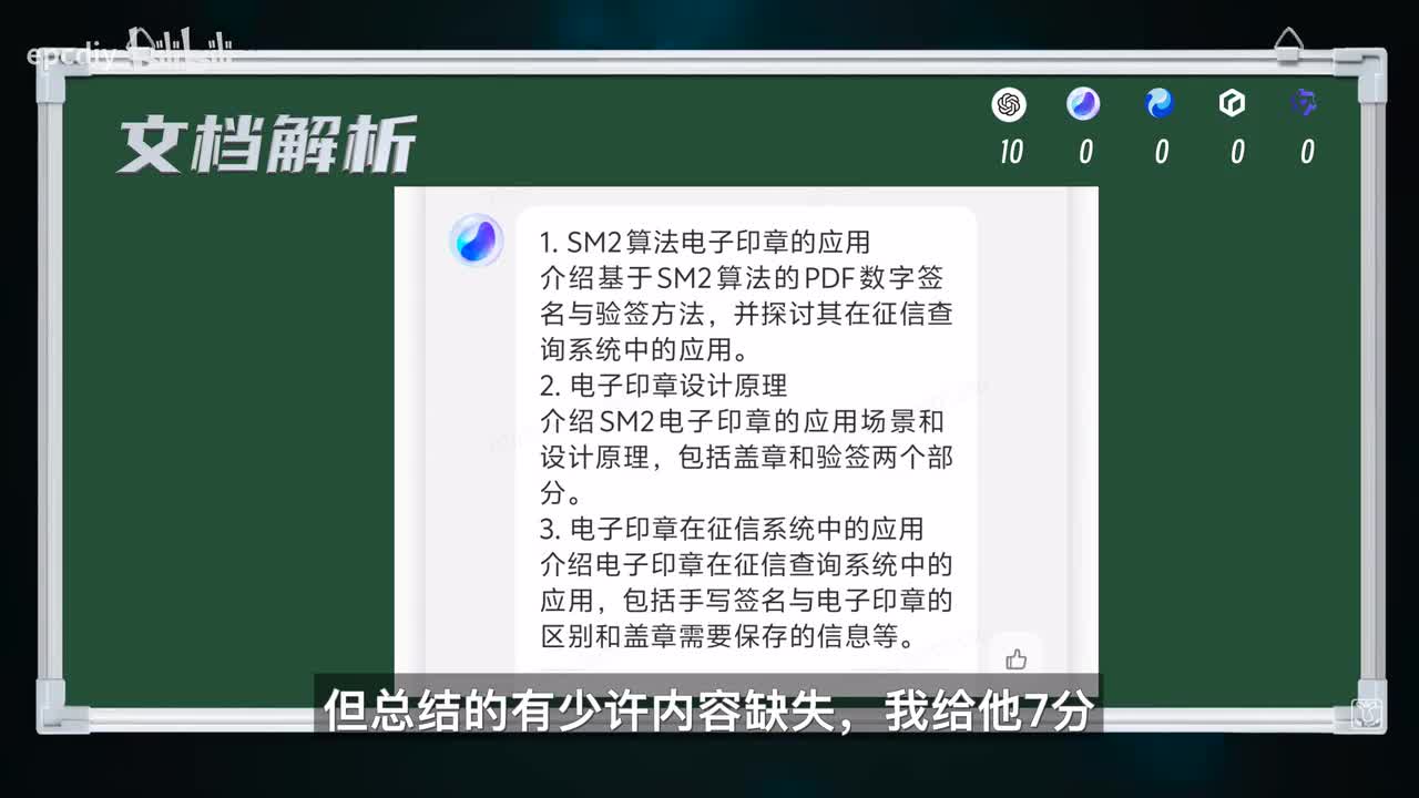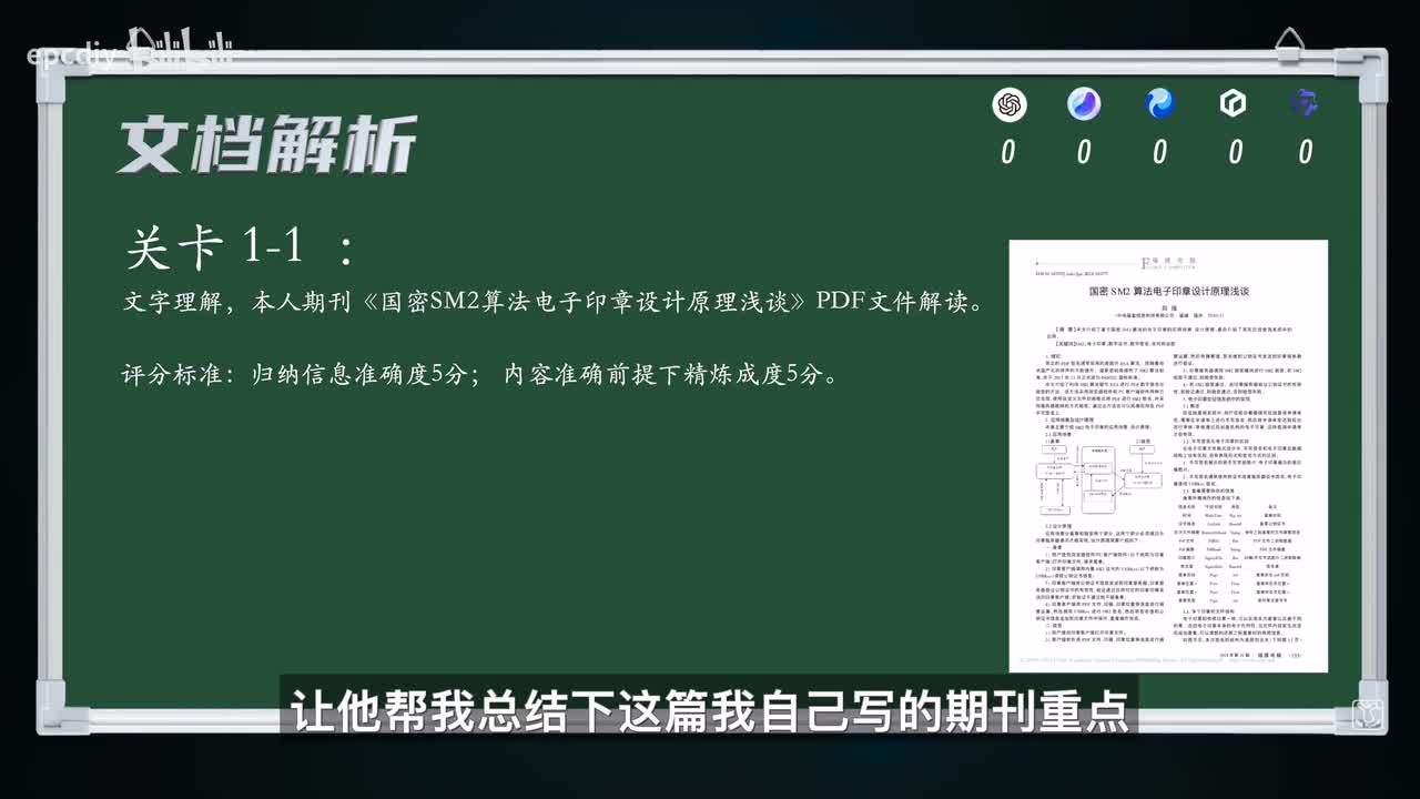 大家可以在评论区里汇总下你们心目中的分数。第一关,理解能力二十分,包含最基础的p d f总结重点表格解析。第一题文字理解。我把我自己写的一篇期刊发给他,让他帮我总结一下这篇我自己写的期刊的重点。这篇期刊叫做国密smart算法电子印章设计原理,浅谈大家感兴趣的可以去的文本的内容的文字表述,内容的信息的准确度五分,内容准确情况下精炼程度五分。