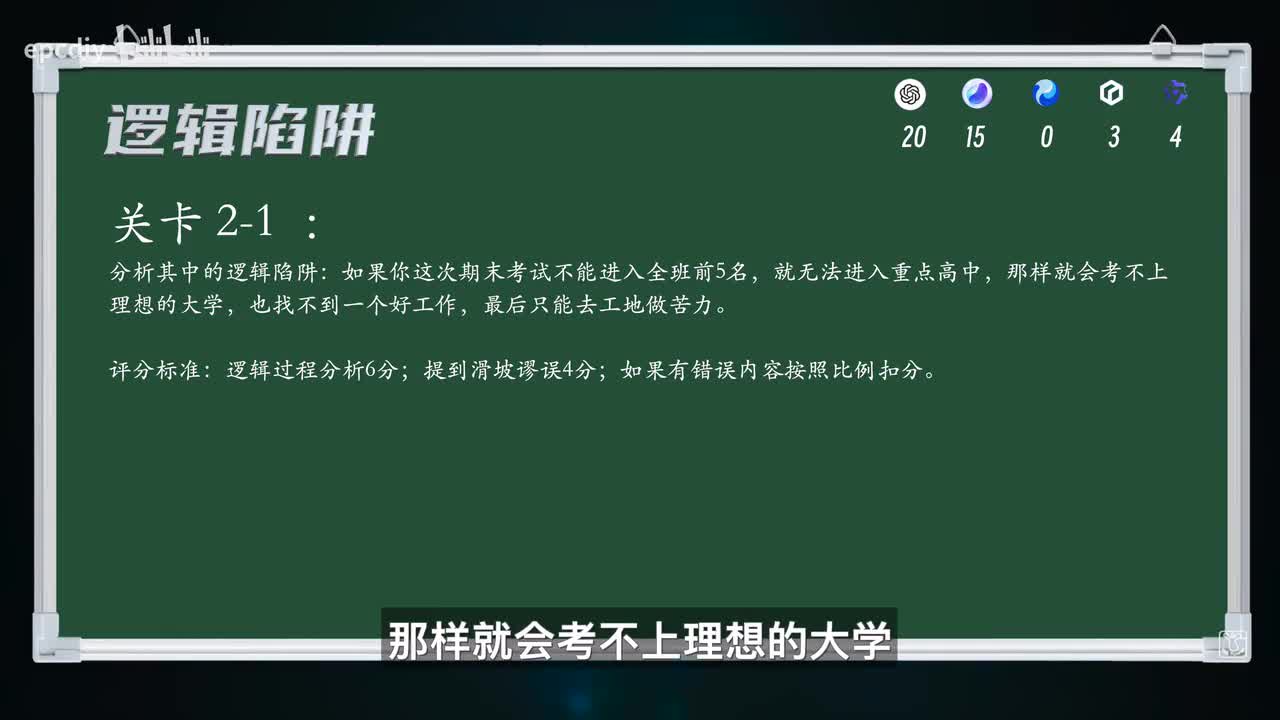 第二关,逻辑能力二十分包含逻辑陷阱、逻辑推理。第一题,分析其中的逻辑陷阱。如果你这次期末考试不能进入全班前五名,就。无法进入重点高中,那样就考不上理想的大学,也找不到一个好工作,最后只能去工地做苦力啊。评分标准,逻辑过程分析六分,提到滑坡谬误四分,如果有错误的内容按照比例扣分。