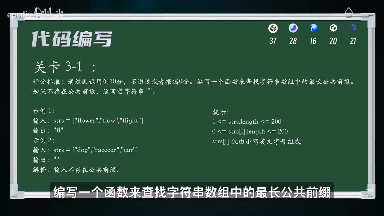 这是二零二二年国家公务员考试的行测题,不知道是不是因为模型训练都包含了这道题了呢?第三关,代码能力二十分包含按照要求编写代码和代码改。错第一题代码编写评分标准通过测试用例十分不通过或者是报错零分。编写一个函数来查找字符串数组中的最长公共前缀,如果不存在公共前缀,返回空字符串。经过验证,蓝星小微的回答正确,十分通义千问用的是python三执行正确十分,混源也是正确的,十分g b t的回答也是正确的,而且讲解也是最详细的。十分文信的代码的执行出错了,所以数组超出了范围。