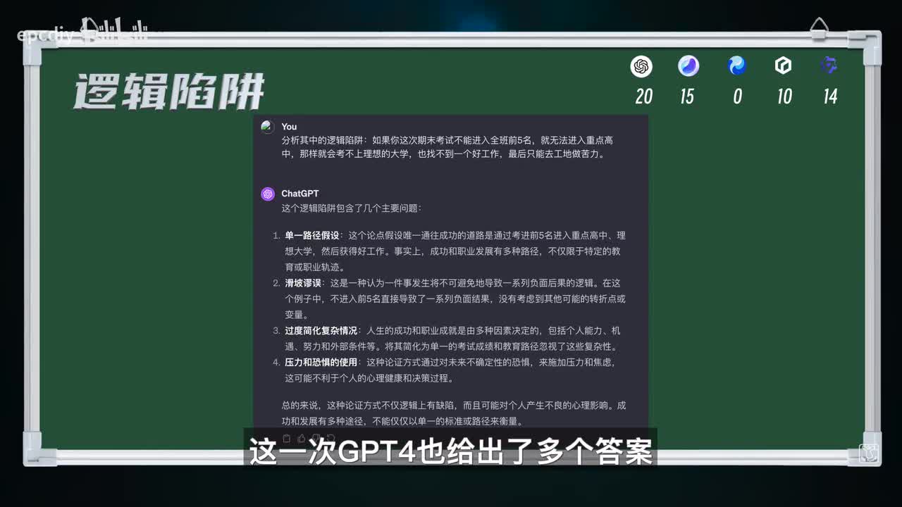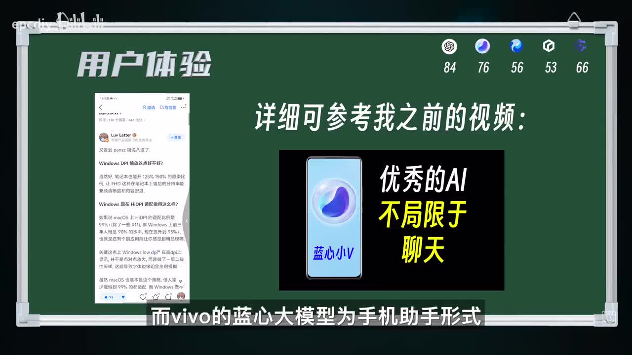 vivo手机的蓝星大模型大家可以看到,这次入选的大模型基本上是我之前视频单独评测过的,蓝星也不例外,之所以叫手机大模型,它的特点是不局限于你问我答,而是与手机功能结合,复杂性更高。同时在c e a公布的榜单里,蓝星大模型的能力均值还能冲进前十,值得一测。最后是我们国内大模型的最终boss chat g p t,这个就不用我多介绍了吧。而且本次我请来了每月二十美元的四点零版本和国内选手做p k看看差距是不是有缩小呢?我们会把比赛分为六个环节,每个环节都有对应的分数,总分一百分。大家可以在弹幕中一起来打分,最后汇总分数,我们看看谁的分数最高。