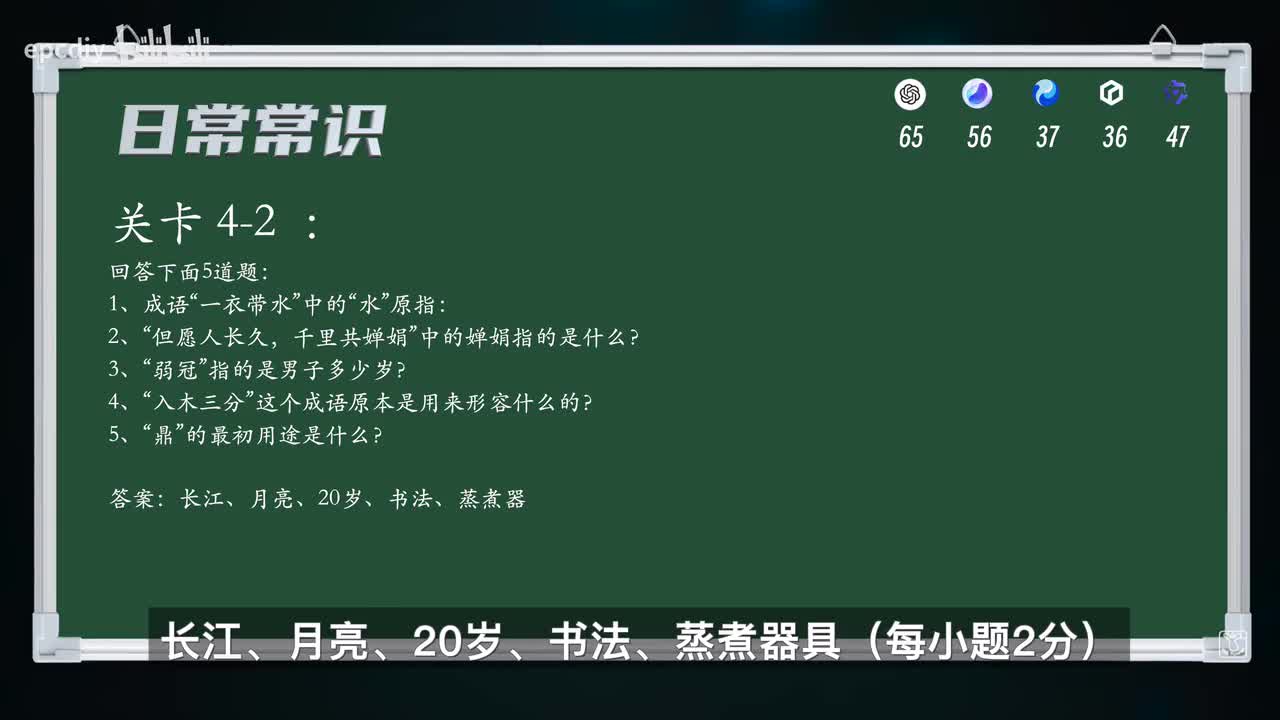 二、但愿人长久千里共婵娟的婵娟指的是什么?三弱冠指的是男子多少岁?四入木三分这个成语原本是用来形容什么呢?捂鼎最初的用途是什么?答案,长江月亮二十岁,书法蒸煮器具,每小题两分。小薇回答都正确十分。通义千问回答都正确十分,混元回答都正确十分。chat g p t回答正确十分。看来常识类基本上大模型都很擅长啊。