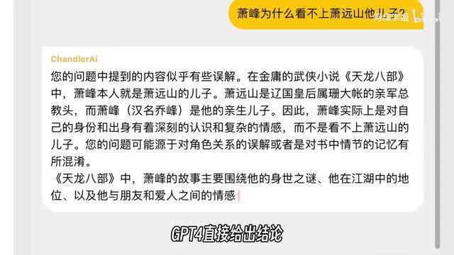 乔峰和虚竹大年喝的什么酒?所有模型都可以准确回答出茅台,全部回答正确。第二题逻辑题,萧峰为什么看不上萧远山?他儿子g p t四直接给出结论,因为萧峰就是萧远山的儿子,非常轻松。同时答对的还有文心一言、kimi通义千问质朴,都给出了丰富的错误的解释,头头是道。