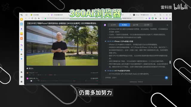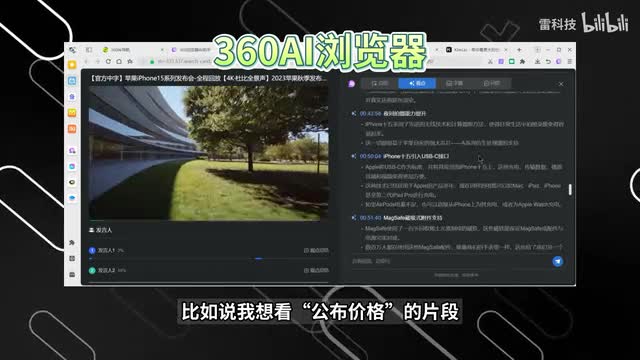 到对话框中就能分析视频生成的内容,大多是简单的摘要总结,然后就没其他功能了,有些简陋啊。视线转移到三六零a i上,在视频播放界面点击a i分析当前页面即可生成内容,以及生成视频摘要、思维导图、看点内容等等等等,其中看点内容支持一键跳转,比如说我想看公布价格的片段,点击三六零ai给出了对应时间点,视频瞬间跳到库克公布价格的画面,就很贴心,你知道吗?还有个更炸裂的功能,那就是发言人智能区分。例如我只想看库克讲话的片段,点击对应的发言人就能跳转过去,大大提高了观众的观看效率以及剪辑师的工作效率。