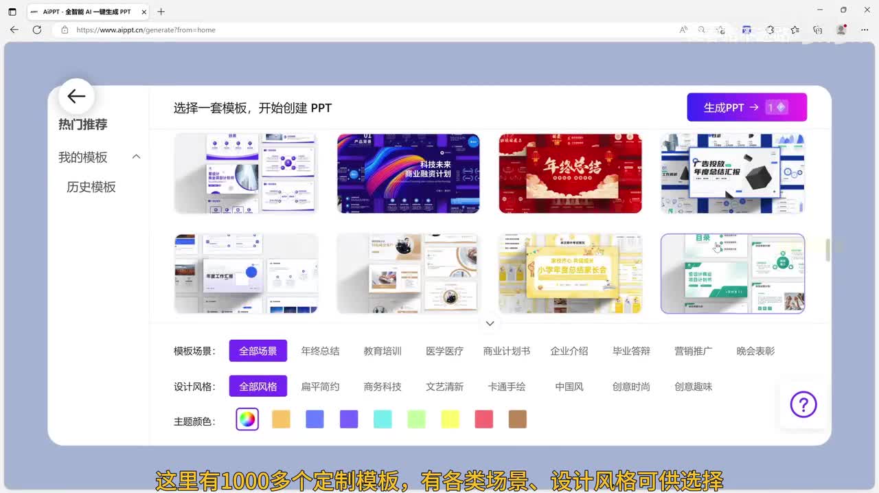 你也可以在此基础上进行微调,然后点击这里选择一个p p t模板。这里有一千多个定制模板,有各类场景设计风格可供选择,而且还在不断更新中,可以满足各种场景需要。