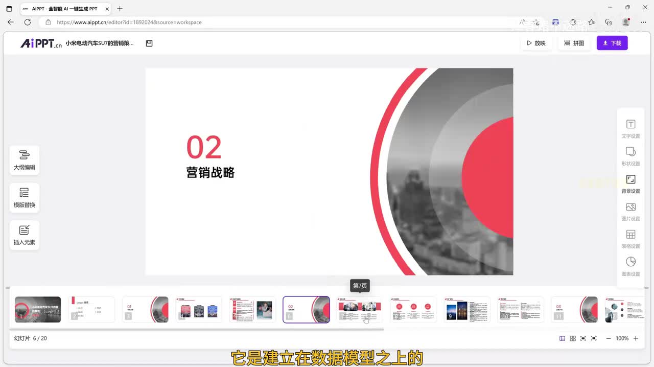 必须要强调的是,这个a i p p t是真的智能,它是建立在数据模型之上的。我分别让他制作了小米电动汽车苏七和五菱电动汽车星光的营销策划p p t。