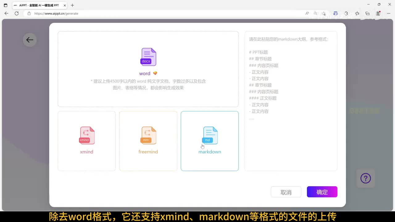 演示的流程一键生成p p t,除去word格式,它还支持x mind markdown等格式的文件的上传。这对于日常工作中需要将各种报告制作成p p t的打工人来说,简直方便极了。