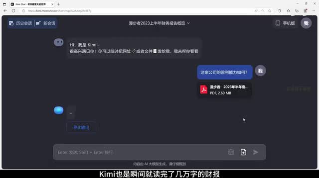 这是一份上市公司的半年财报,超多的数据和各种表格上传给kimi,问一下这家公司的盈利能力如何,kimi也是瞬间就读完了几万字的财报,并给出了分析和结论。kimi支持超多格式的文档处理。