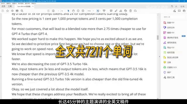 这是sam奥特曼在首届open a i开发者大会上长达四十五分钟的主题演讲的全英文稿件。把它拖动到kimi,它就能告诉你这篇演讲的主要内容。