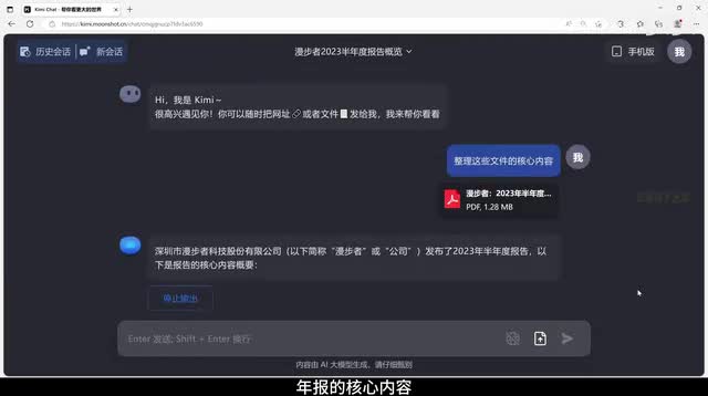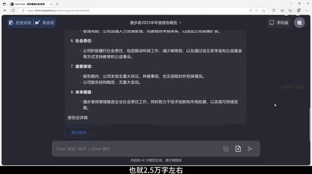 这是一篇八万六千多字的上市公司半年报,千头万绪,不知道从哪里开始看起,把它上传到kimi,马上就可以为你提炼出年报的核心内容。八万六千字,这还不是kimi的极限,kimi可以一次性处理二十万汉字的长文本,是全球唯一能做到如此大篇幅汉字输入的a i大模型。