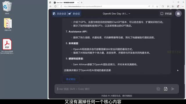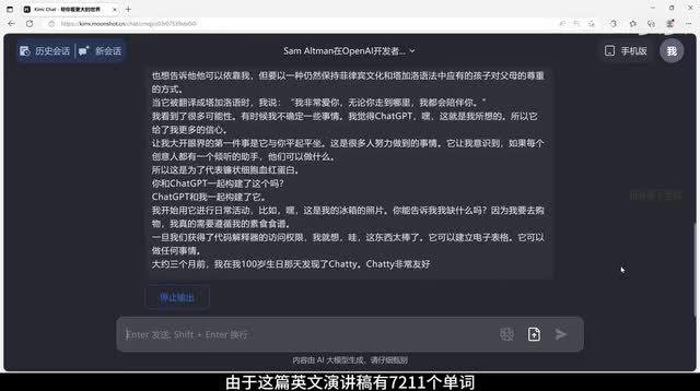 我看过两遍这个演讲稿,kimi的这个总结非常的全面简洁,又没有漏掉任何一个核心内容。让他把sam的这篇英文演讲稿翻译成中文也没有问题。