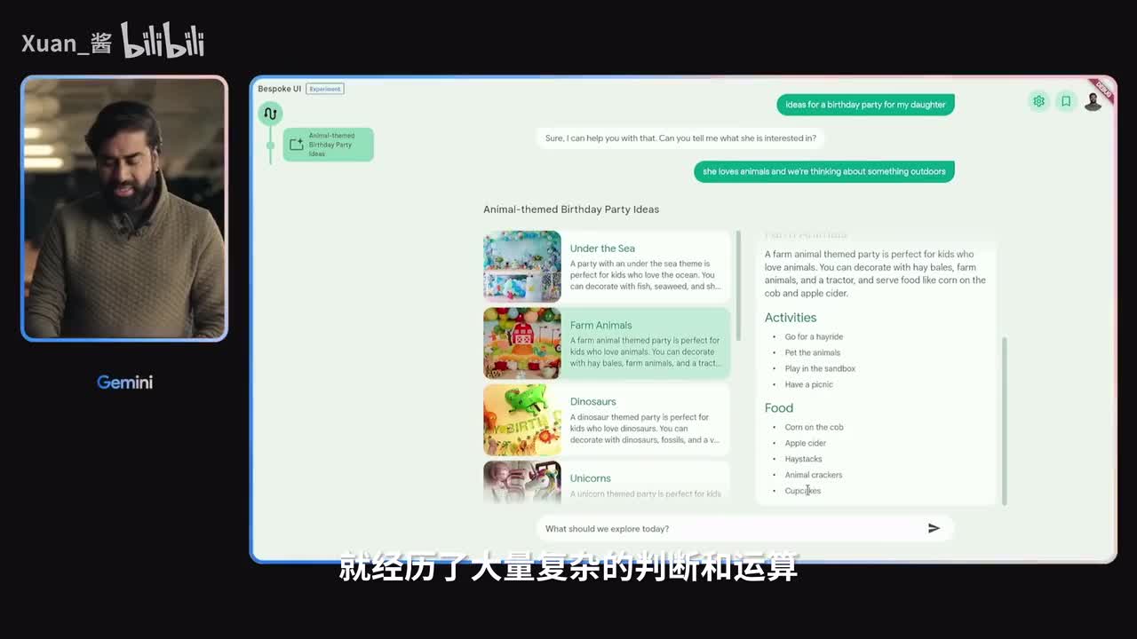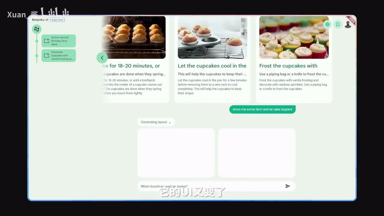 所以震惊我的是german i在处理复杂问题的实时交互能力比g p t的文本生成能力要迈出更大的一步。比如说在这个demo中,根据这些信息,它就可以很快的生成多种图文并茂的方案。带u i设计的非常的精致,在它生成的答案的基础上问他怎么做cupcake蛋糕,step by step, 然后它生成的u i又变了,是这种横向的,可以很清晰的看到步骤的呈现方式。