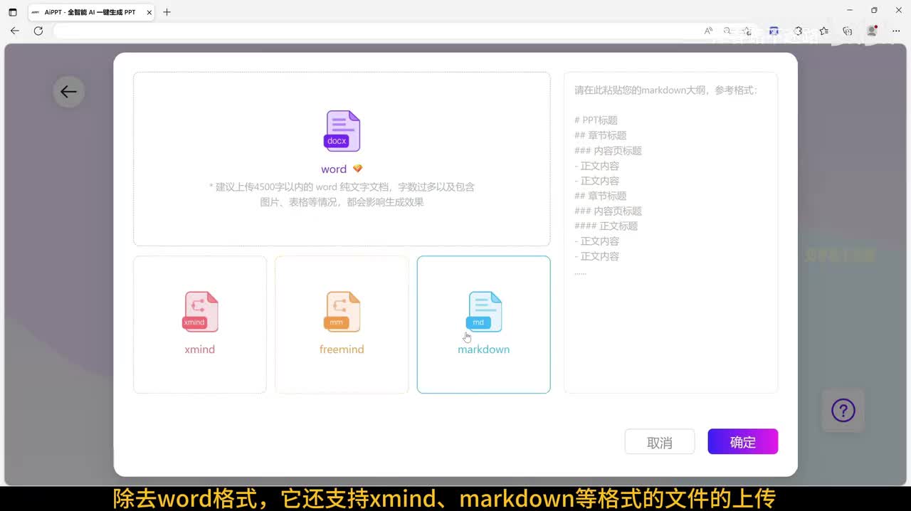 演示的流程一键生成p p t,除去word格式,它还支持x mind markdown等格式的文件的上传。这对于日常工作中需要将各种报告制作成p p t的打工人来说,简直方便极了。