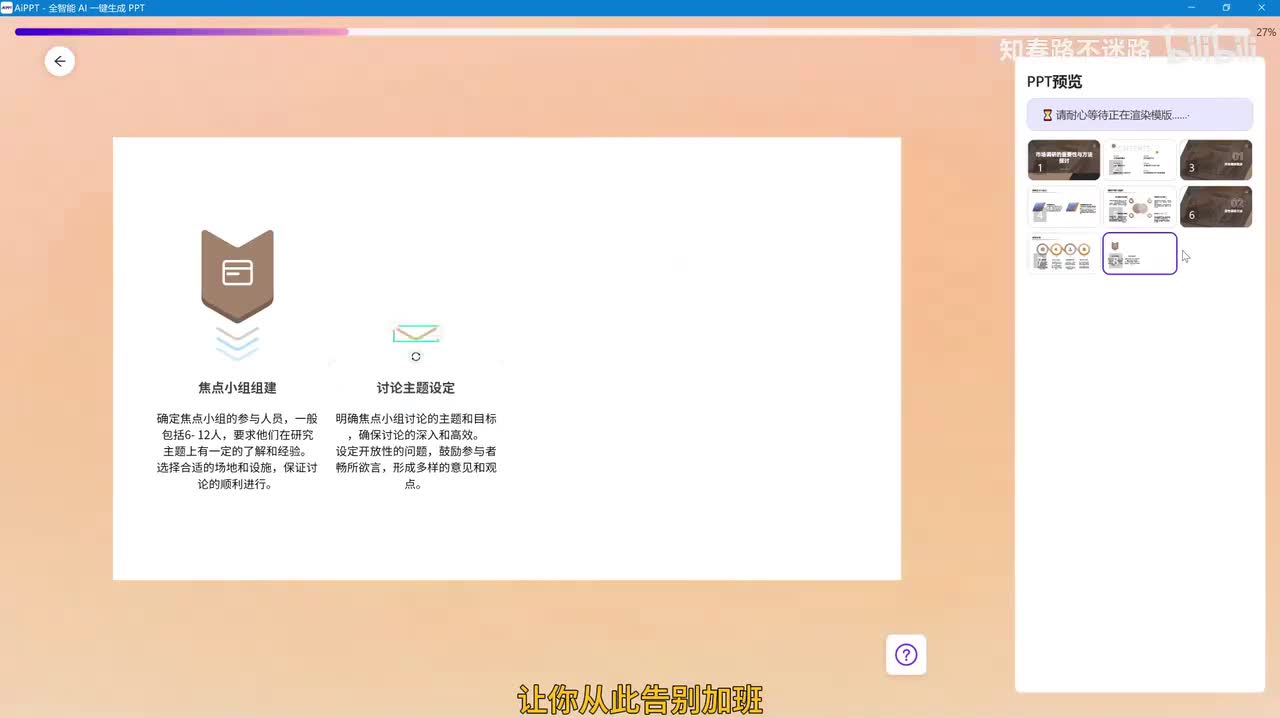 选择好后,点击这里即可生成p p t生成速度非常快,品质和时间比是人工的几十倍。你可以根据需要对生成的p p t进行形式和内容上的微调编辑,然后导出为p p t文件,一个p p t的制作就完成了。