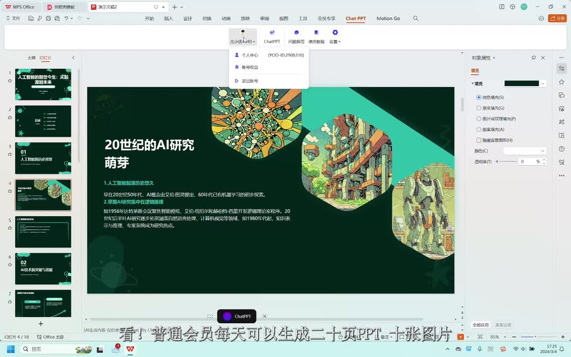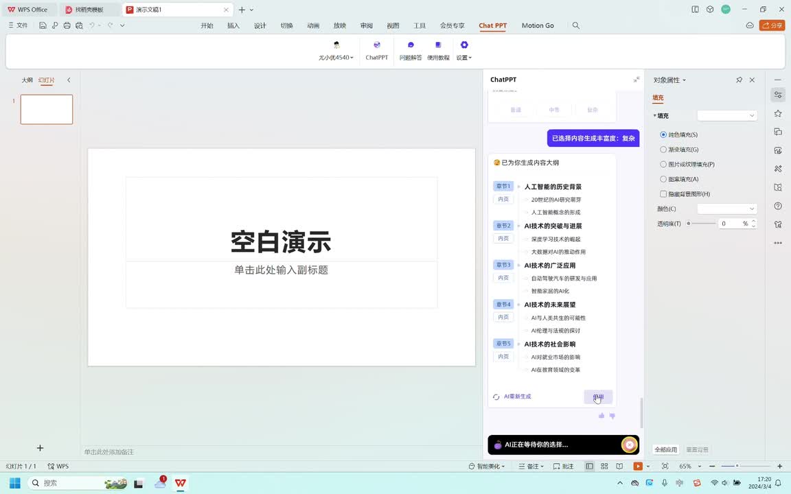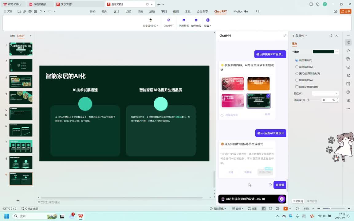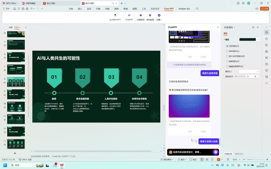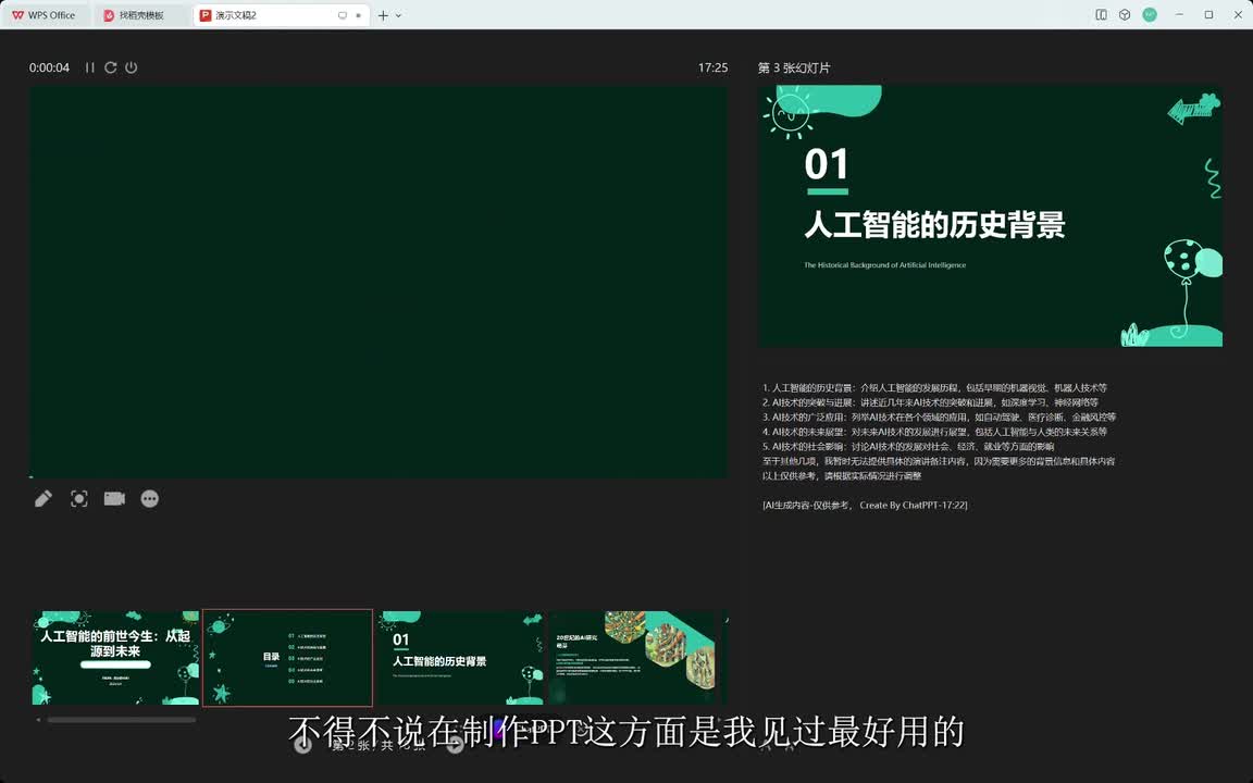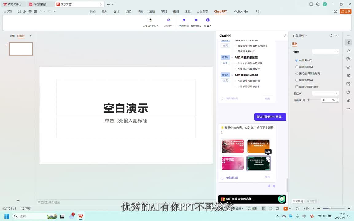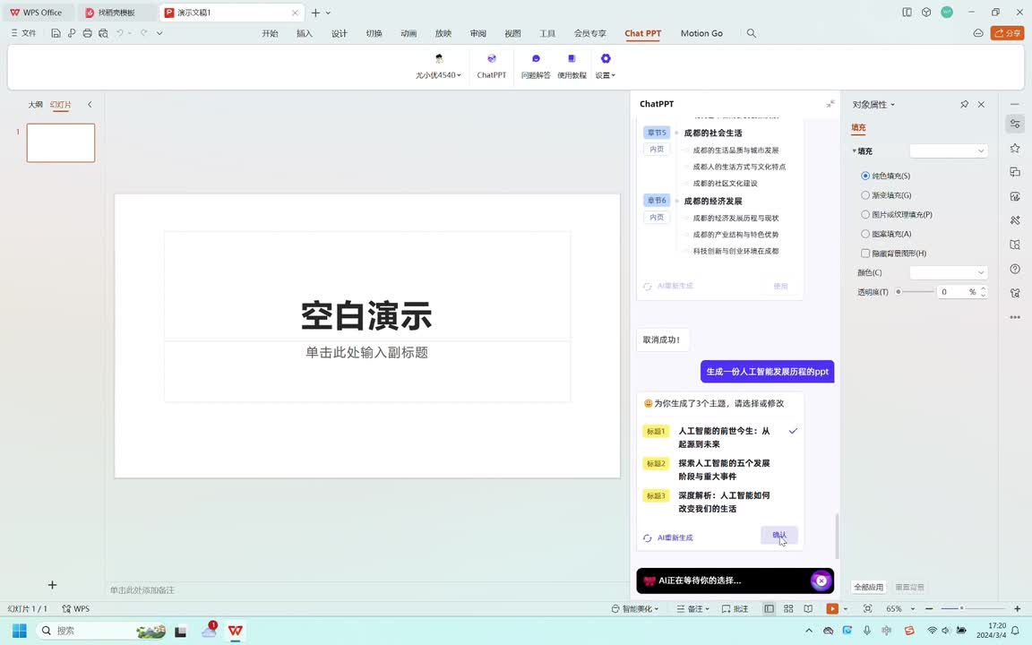 现在我们来生成一份人工智能发展历程的p p t,看看a i制作的p p t怎么样。a i正在设计p p t主题风格,好期待啊。