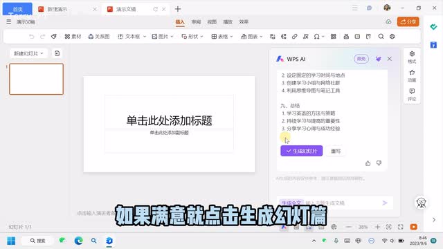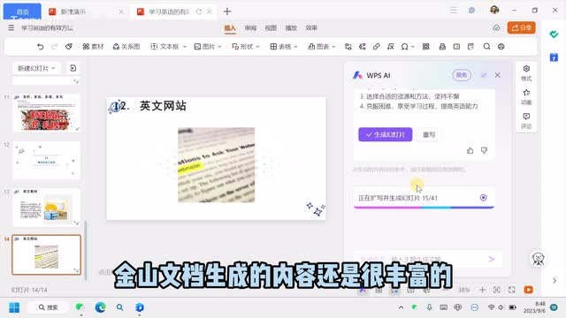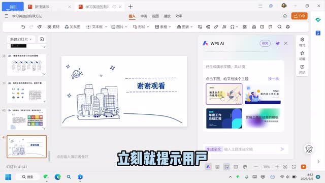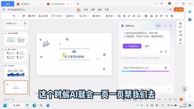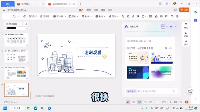 学习英语这个话题,他一共帮我们生成四十一页p p t,很快a i就帮我们生成了所有的p p t内容。