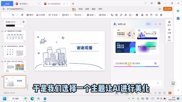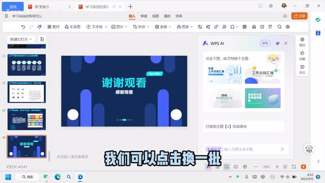 总共四十一页a i在完成p p t制作以后,立刻就提示用户可以修改对应的主题。