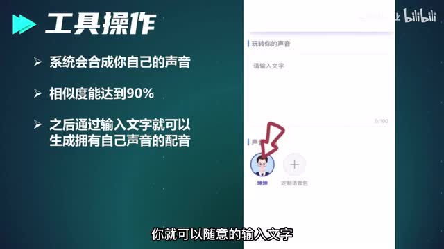 接下来文本框里啊会给你一行文字,我们把这行文字啊给它逐字的朗读一下,朗读完了之后呢,系统啊会自动合成你自己的声音,这个逼真的程度能够达到百分之九十。