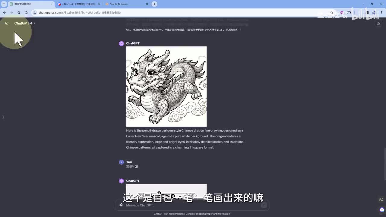 但是你得到的结果可能会是这样的啊,不是很尽如人意,肯定是过不了关的。我呢分享一个更好的思路吧,我建议你呢先整个线稿对吧?如果你没有办法一笔笔的去把线稿画出来的话呢,也没关系,我们还是可以借助chat g p t,依然是上面的这个描述,只是加一个线稿啊,你就会得到这样子的一个结果。这个时候如果你有画画的基础的话呢,你就可以完全把这个线稿拿到p s里面,自己改一改里面的这个逻辑错误了。