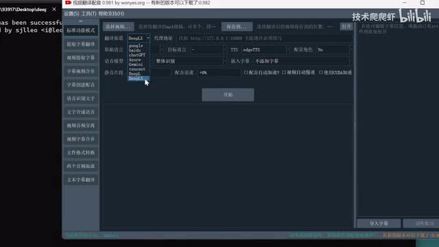 然后我们把deep l x这个项目启动起来,这样它就开始监听幺幺八八端口。我们翻译的时候,这里的翻译渠道就选择deep l x。然后我们选择视频,这里选择原始语言目标语言,就简体中文配音角色,这里我选择。