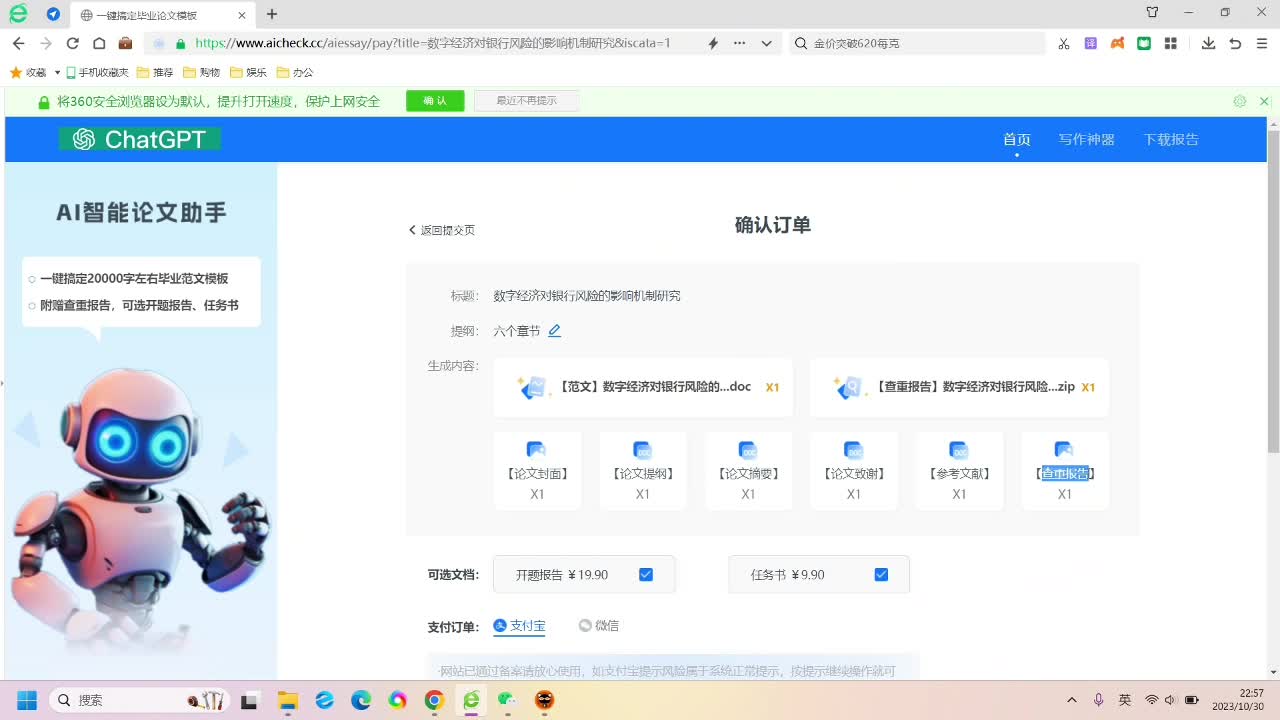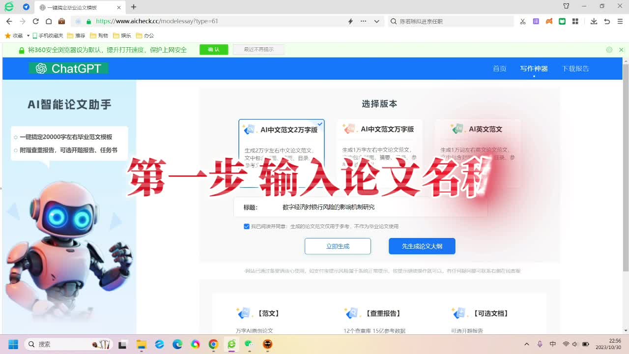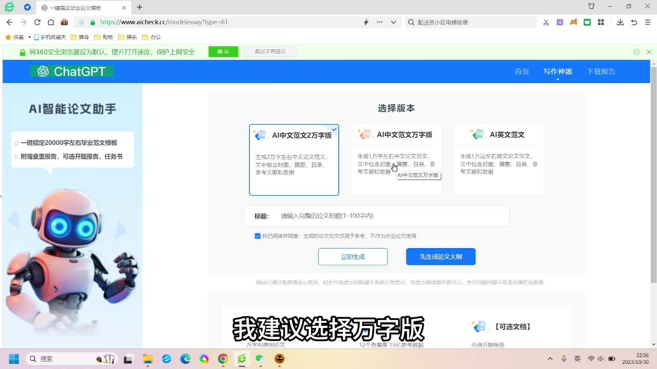 好,我们点击立即生成,这有几个选项。如果说我们是本科生,我建议选择万字版,硕士的话可以使用两万字版。这个也看自己学校的要求。