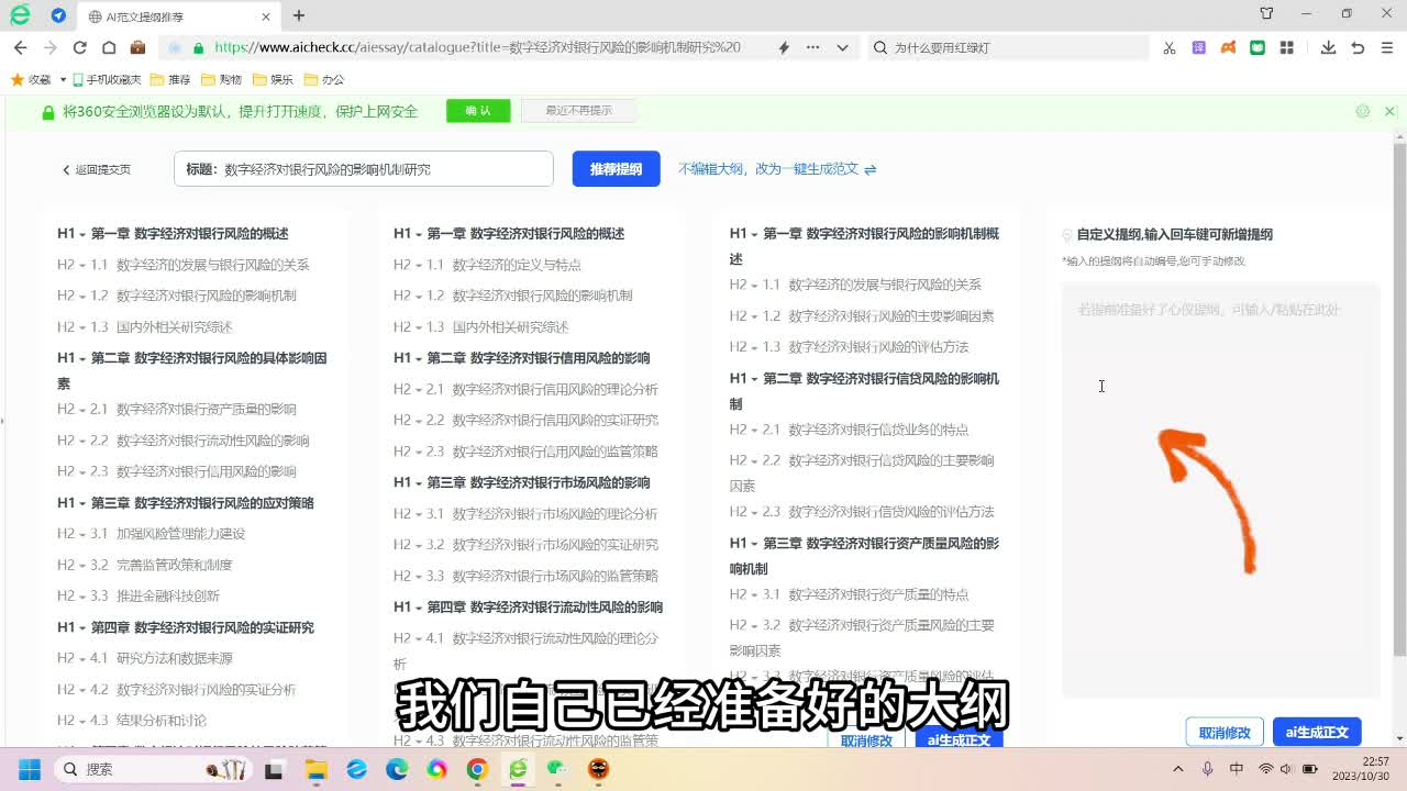 如果觉得a i生成的都不满意,或者是我们自己已经有了大纲的情况下,我们可以在右边输入我们自己已经准备好的大纲。在这里我就随便选一个a i给我们生成的大纲。给大家举个例子,用这个第三个直接生成正文,到了这个界面可以看到。