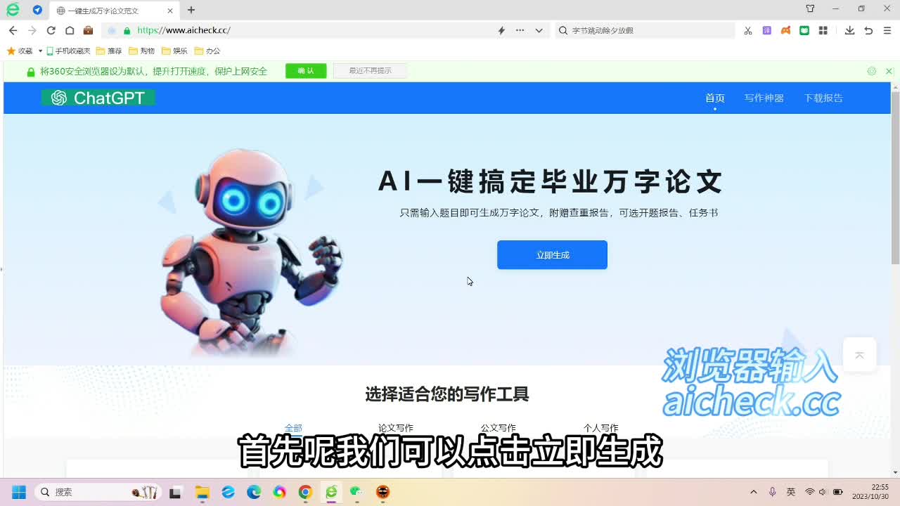 好,我们现在进入了a i check点c c的官网,下面呢我将教大家怎么去使用。首先呢我们可以点击立即生成,也可以点击下边的各种工具。比如说a i两万字版、万字版、英文范文、职称范文。