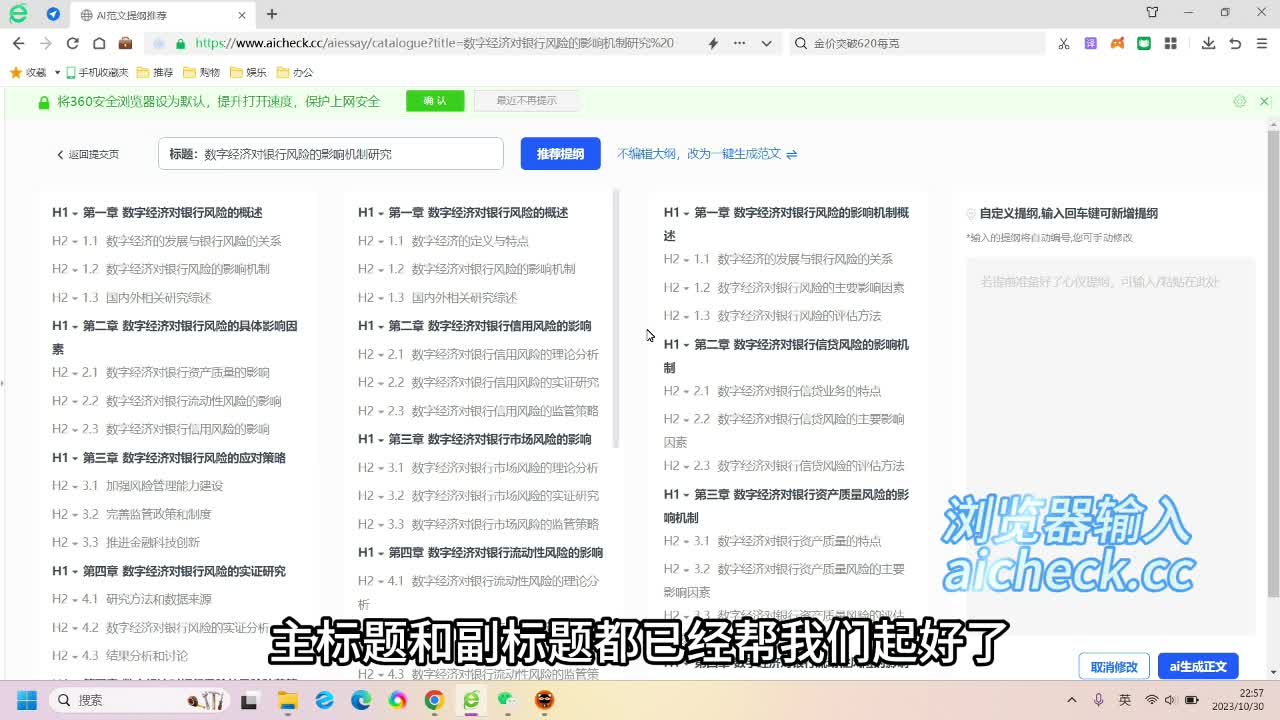 好,现在大纲已经生成好了,a i呢给了我们三个选项,这个三个选项主标题和副标题都已经帮我们起好了。如果我们觉得这三个里边有不错的,可以直接去a i生成正文。如果说里边有一些内容想自己去调整,也可以进行修改。
