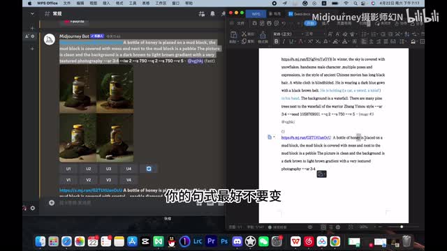 一个一罐蜂蜜放在了一个泥块上,我泥块上是covered with覆盖着苔藓,泥块的旁边有鹅卵石。嗯,图片很干净,背景是深棕到浅棕的渐变背景,非常有质感,是摄影的质感。这些是我的后缀,对后缀不理解的可以去我的journey入门教程看看。