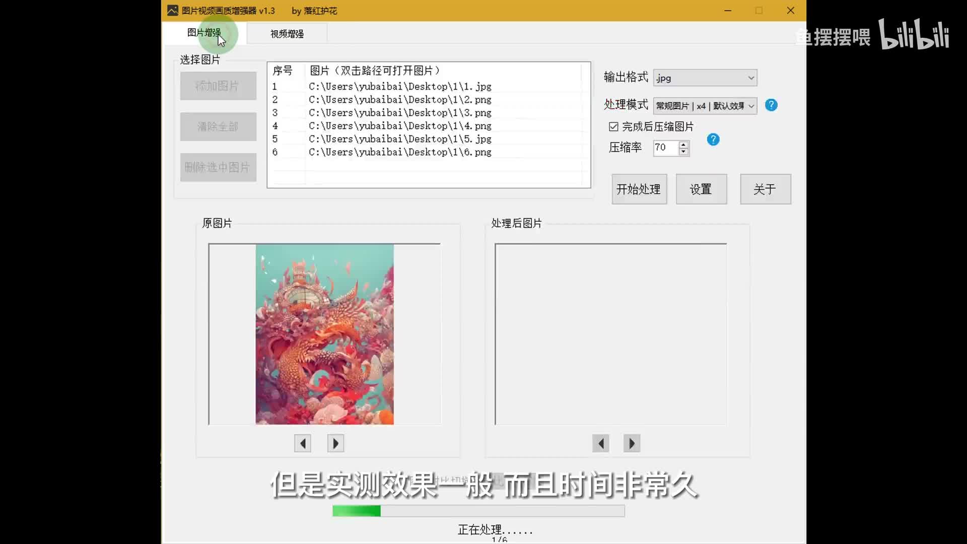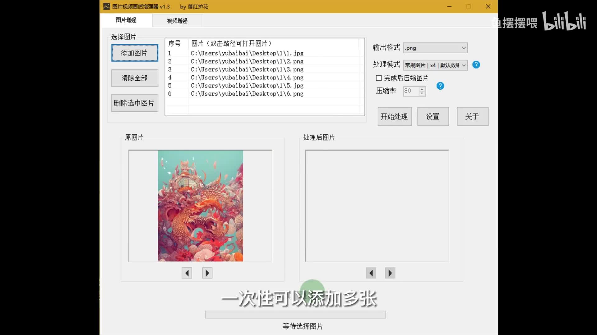 缺点是不太稳定,偶尔出现bug。大家下载安装软件后,打开会出现一个非常简单的操作界面,点击左侧添加图片按钮。可以选择需要放大的图片,一次性可以添加多张。添加完后右侧可以选择图片输出格式和处理模式。上面两个会有细微的差别,而动漫模式适合用来处理动漫风格画风的图片,还可以选择处理完后压缩图片大小。