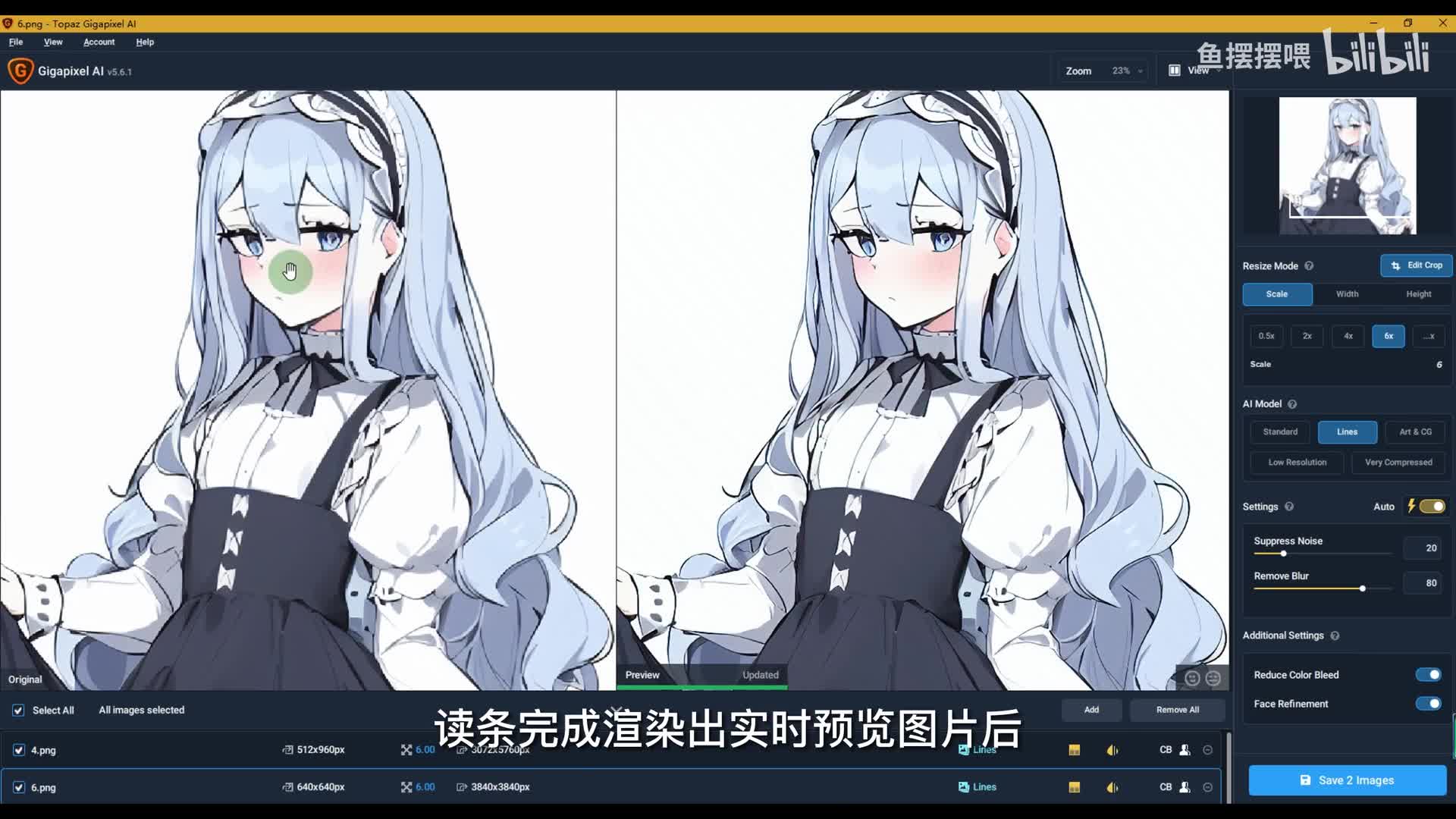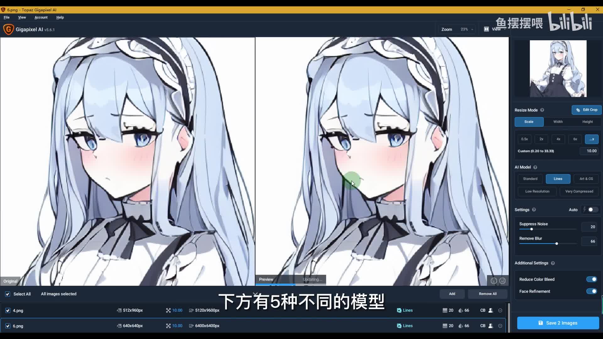 下方可以选择放大的倍数,零点五倍、两倍、四倍、六倍,也可以选择直接输入倍数,从零点二到三十三倍自由输入。嗯,至于为什么会有零点几?是的,它不仅可以放大,还可以缩小。下方有五种不同的模型或者说模式可供选择。我们可以把鼠标移至上方预览,常用的为为上面三种standard标准模式,亦为万金油懒人专用lines线条模式,适合二次元的图以及建筑等线条比较多的图片。