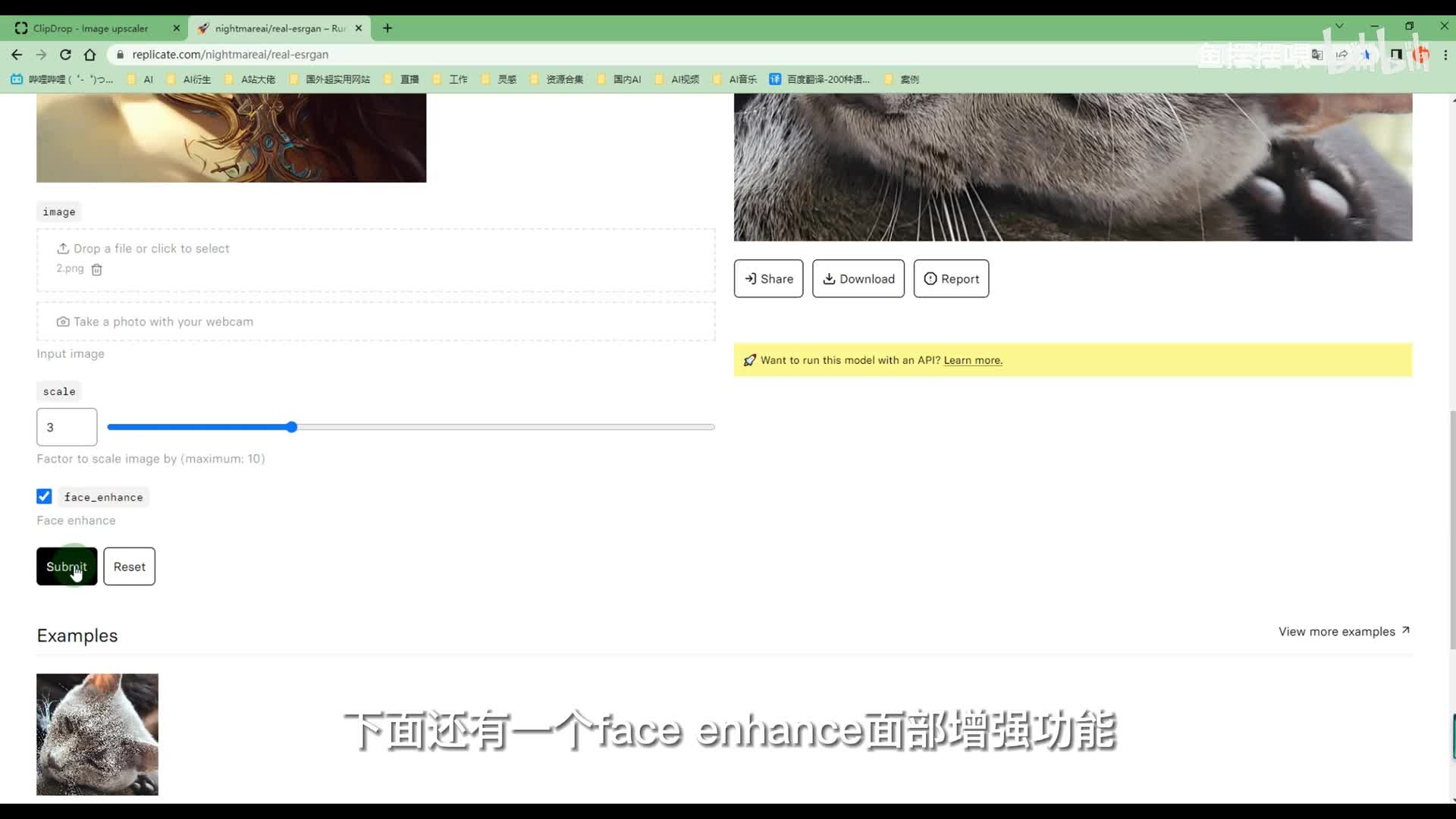 打开网站后无需登录。只要下拉页面找到图片上传区,点击后选择需要放大的图片,然后选择这个参数,可以理解为放大的倍数。选择好以后,下面还有一个face in hands面部增强功能,是专用于处理人像照片时候可以选择的。设置好了以后,点击submit就可以开始处理。处理完成后的图片会显示在右侧,觉得没问题以后点击download下载即可。