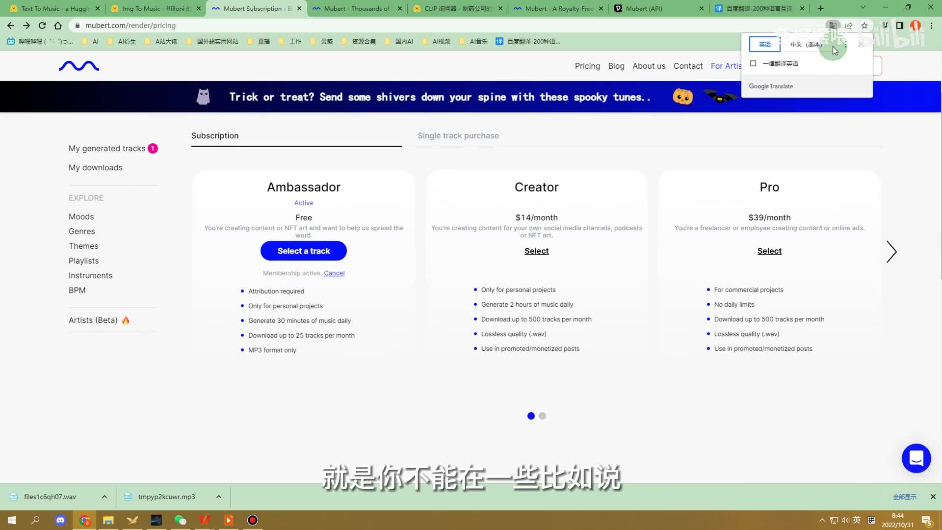 总结一下呢,第一它主要是生成一些背景音乐,暂时没有特别复杂的一些编曲或者生成比如说有人声的,这个暂时是没有的。第二个的话呢,它一般不会涉及到版权的问题,只要你按照这个网站的协议,比如说你是付费用户,那么你可以拿它来进行商用。但是呢有一个原则,就是你不能在一些比如说上传上传音乐的网站上面标明说这是你的原创啊,这是不能的。比如说就是这个不包括u g c的这样子的一个协议。但是呢如果你在上交了他的,比如说这个三十九美元一个月的时候,你这个在这个页面上下载的任何一个音乐,或者说生成的任何一个音乐,都是可以用来商用的。