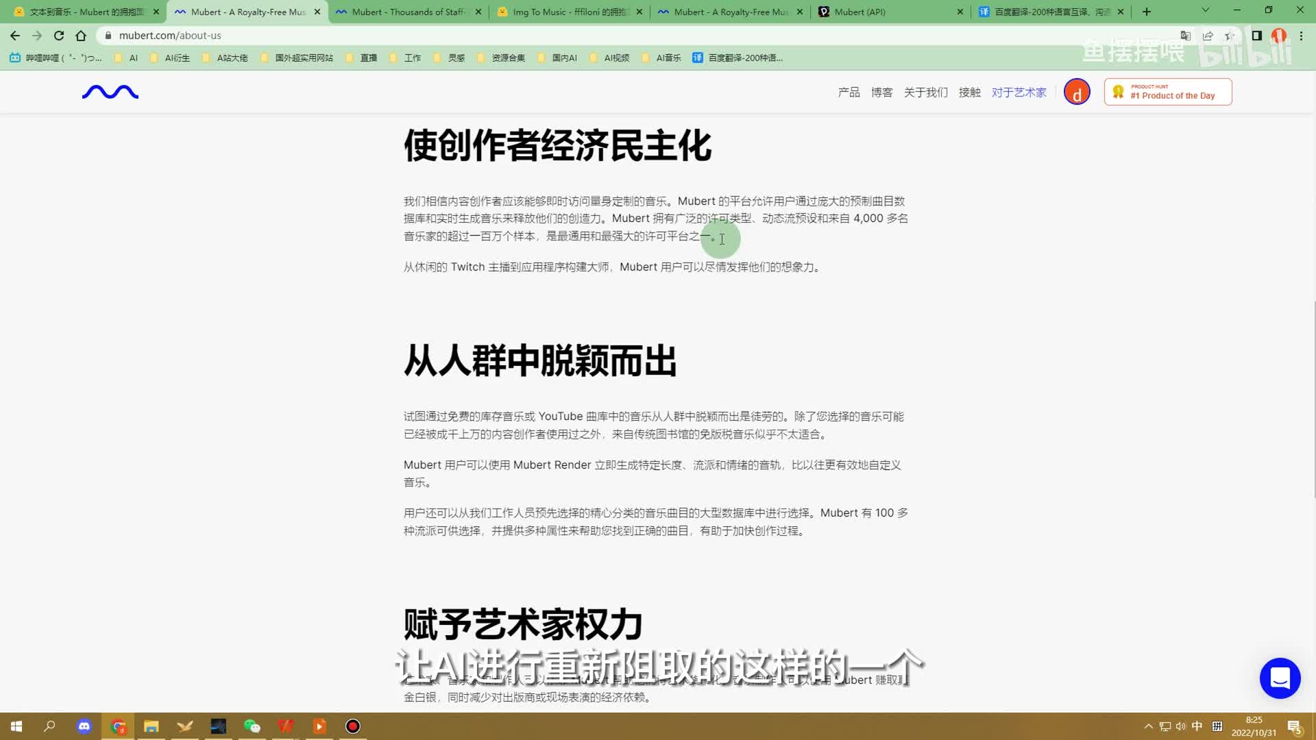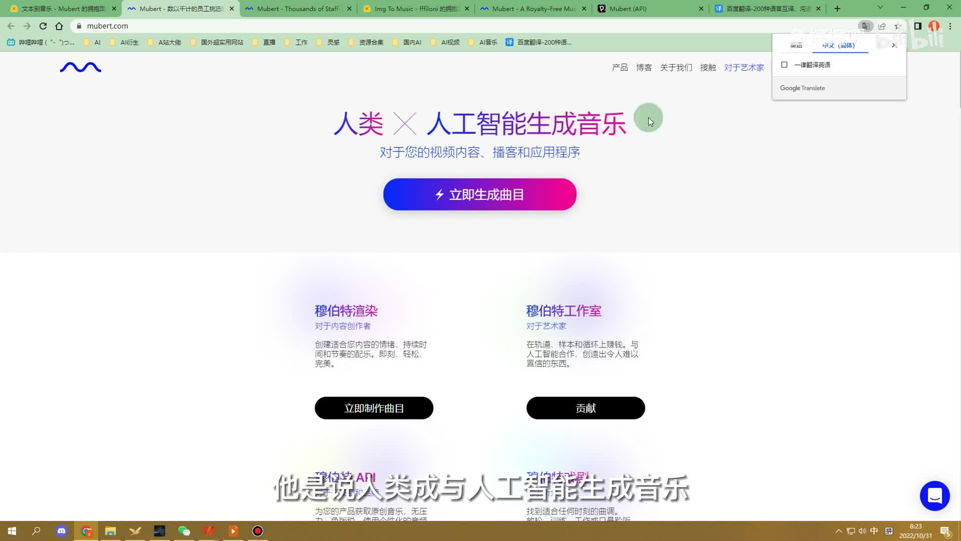 那么开始的时候呢,我们是进入到这样子的一个界面。这个界面的话就是文字转音乐的这样的一个界面,这个地址我会贴给大家。然后呢,这个a i的名字叫Mubert。在使用它之前呢,我们看到这里有一个它的网站的一个主页。我们点进去,我们就来到了这个主页。我们点击这个翻译,我们可以看一下啊,它是说人类乘以人工智能生成音乐,就是它不是完全的人工智能生成音乐,它是由人类主导的。我们可以点击这个上面关于我们这里,然后了解一下这个团队,他们呢是一个借助音乐家与ai配合工作的这样的一个协作平台。那么它跟ai绘画有什么不一样呢?就是ai绘画的话,它可能是抓取互联网或者是说模型库当中的大量大量的图片来进行训练。