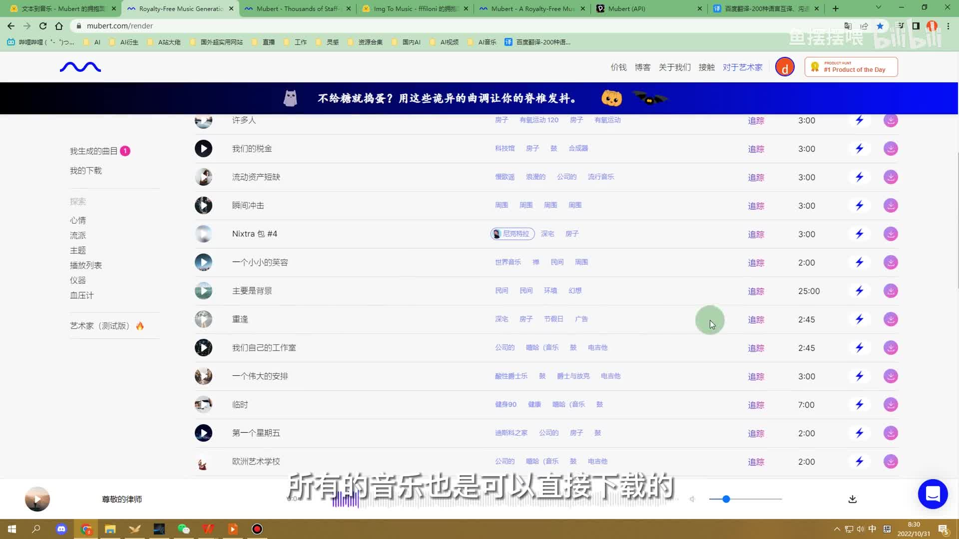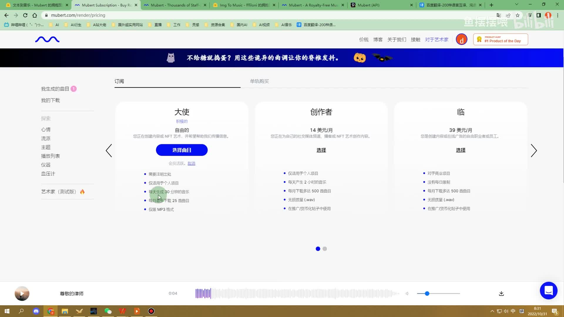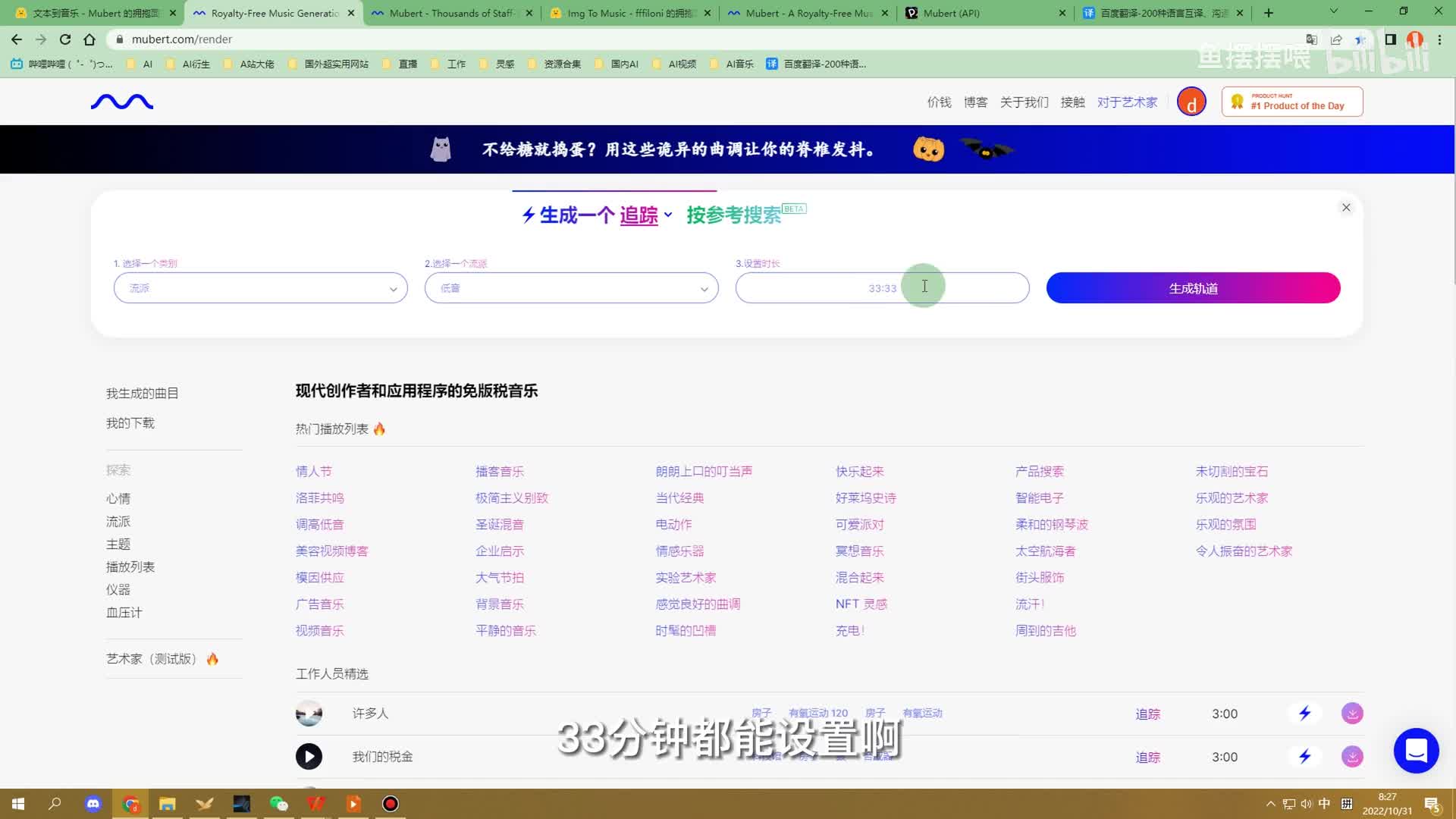 但是这个Mubert的话,它是通过四千多名音乐家的超过一百万个音乐demo的样本。然后呢通过购买这些样本的版权以后,加入到自己的库中用a i进行分类。然后我们使用者通过书写描述语,或者是说添加标签来让ai进行重新读取的这样的一个结果。所以这个和ai绘画在本质上还是有比较大的不一样的。而且在这个平台上生成的音乐,在你购买了它的协议之后呢,你是可以进行一个商用的。这个我到后面再跟大家讲。o k我们再回到这个主页当中,我们点击这个立即生成曲目,我们就可以看到在它的主页当中呢有非常多的一个选项。