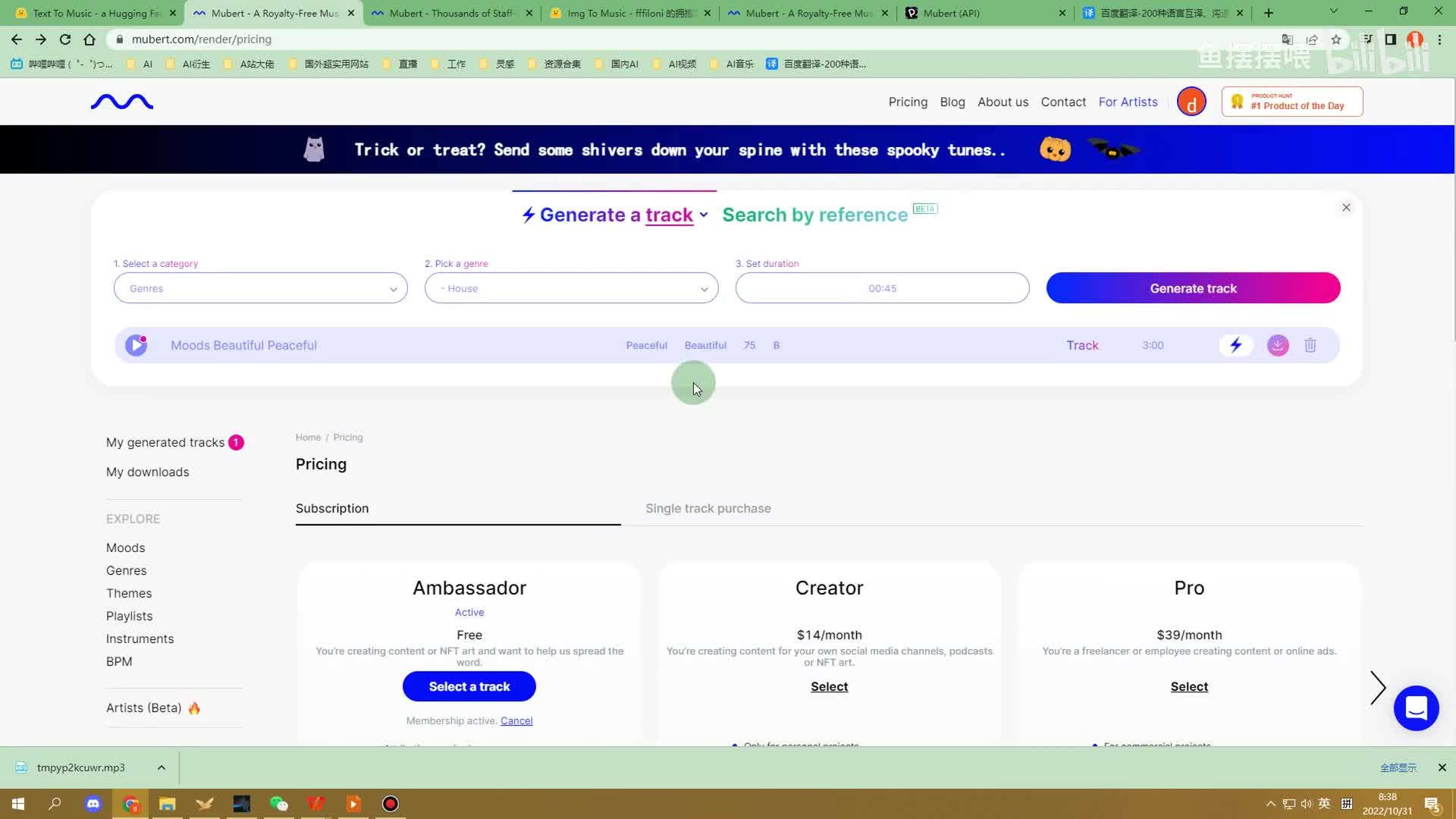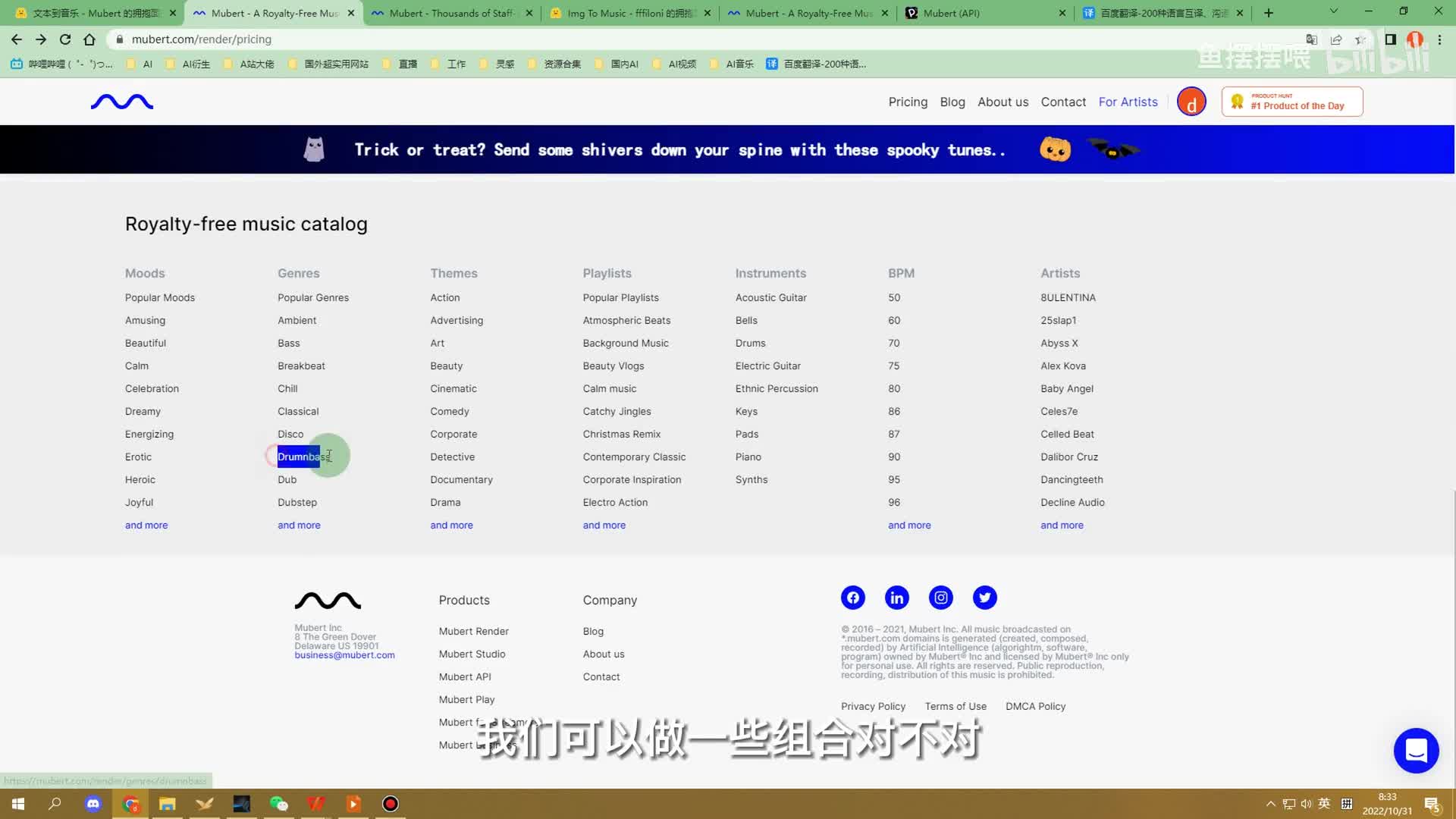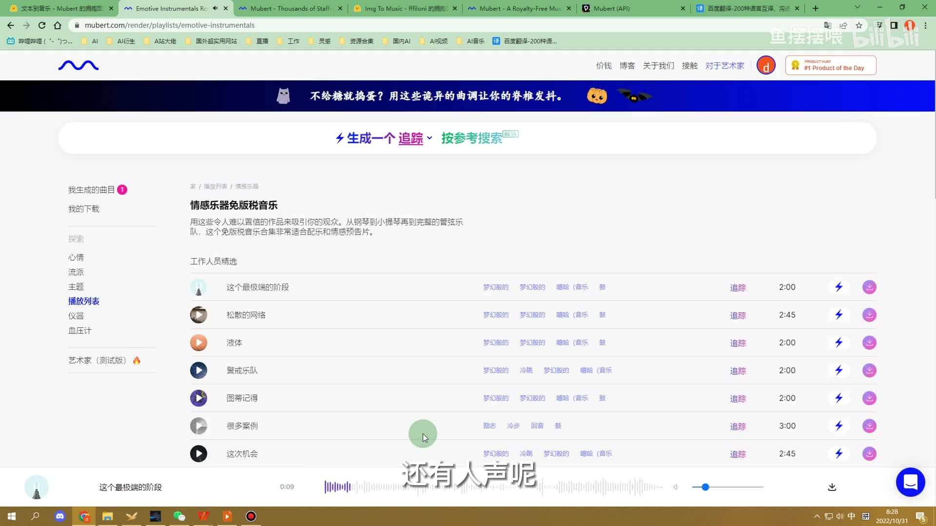 但是这个Mubert的话,它是通过四千多名音乐家的超过一百万个音乐demo的样本。然后呢通过购买这些样本的版权以后,加入到自己的库中用a i进行分类。然后我们使用者通过书写描述语,或者是说添加标签来让ai进行重新读取的这样的一个结果。所以这个和ai绘画在本质上还是有比较大的不一样的。而且在这个平台上生成的音乐,在你购买了它的协议之后呢,你是可以进行一个商用的。这个我到后面再跟大家讲。o k我们再回到这个主页当中,我们点击这个立即生成曲目,我们就可以看到在它的主页当中呢有非常多的一个选项。