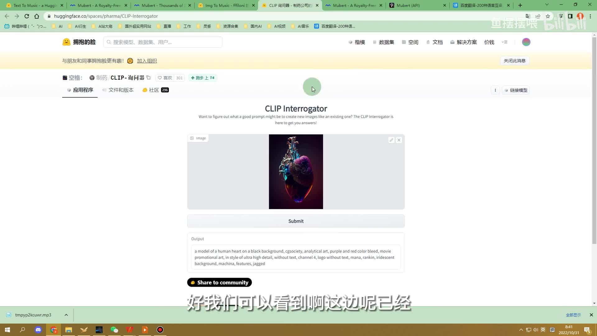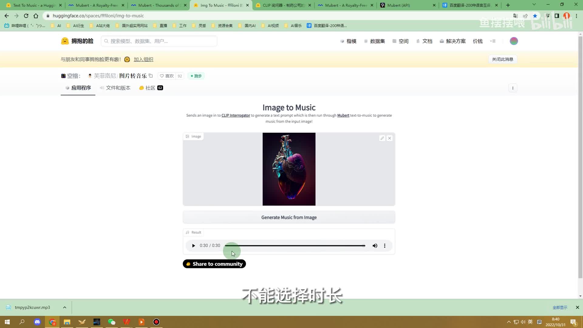 比如说我们现在用我的一张,比如说我画的一个心脏的图,让他来去生成一个音乐。这个的话呢默认是只能生成三十秒的一个音乐。不能选择时长,我们点击这个让它去生成。好,我们回到这个clip询问器里面来看一下。比如说我们把刚才的这个心脏的图片给上传上去。然后点submit,然后让他分析一下我这个心脏有可能是什么样子的一个描述语。