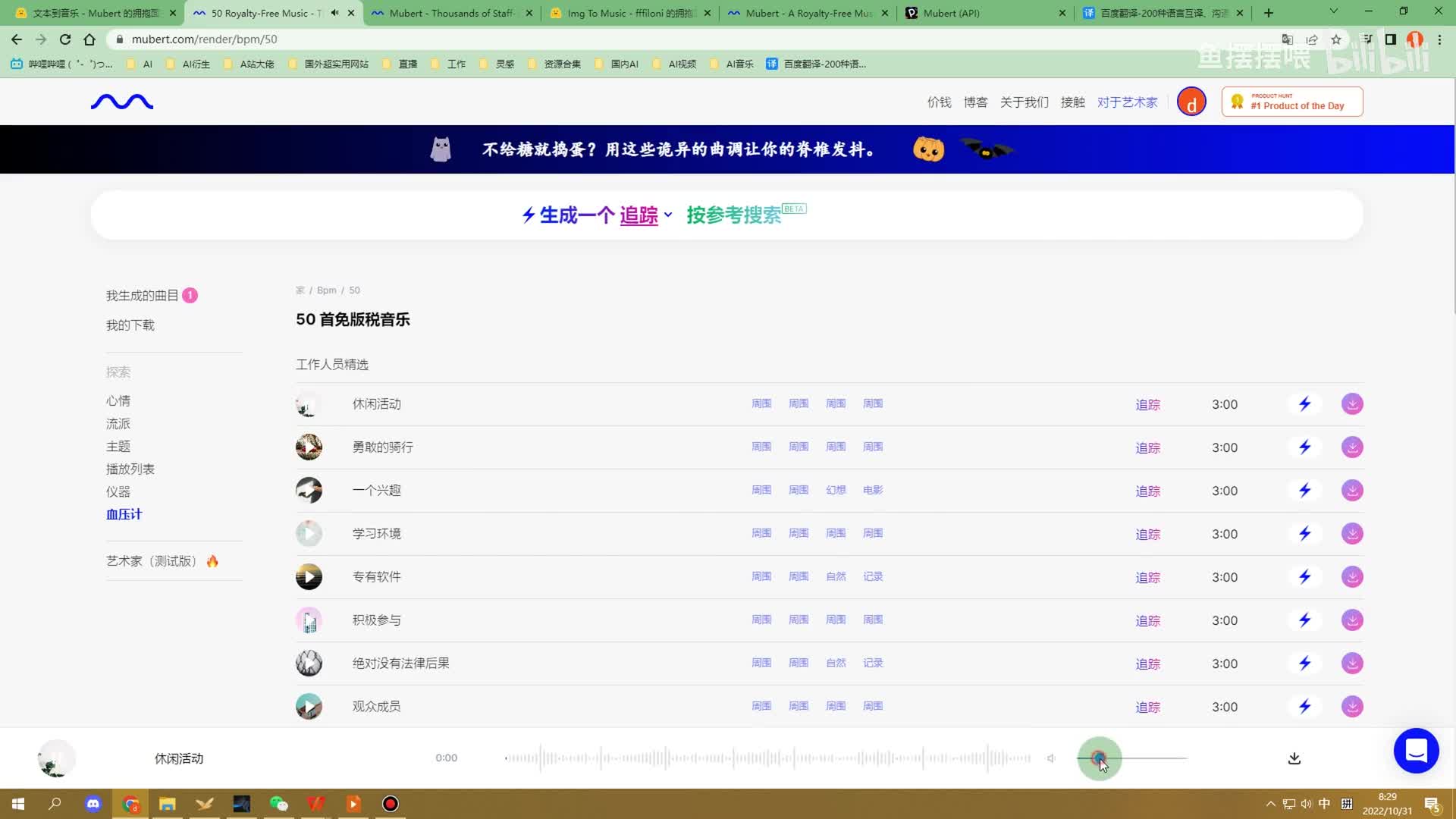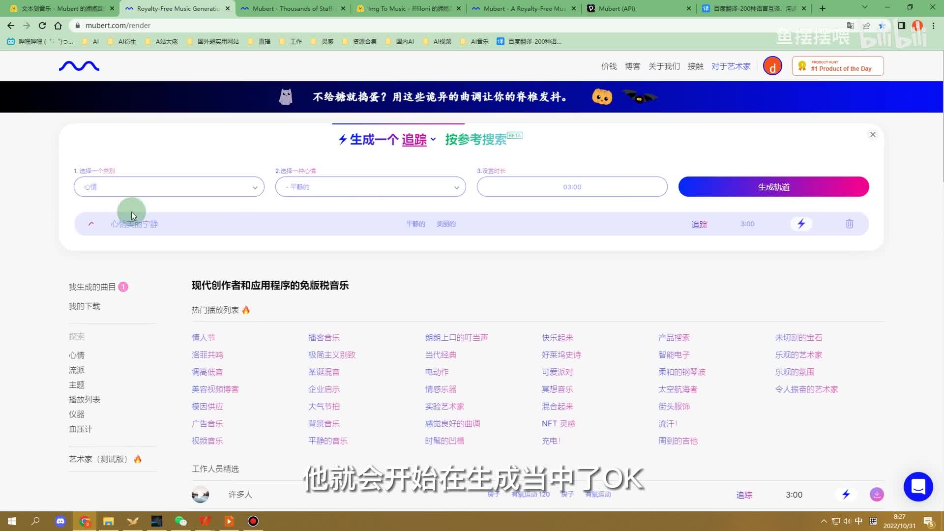 比如说从心情好,我们选择一个。这些翻译的话呢,它是机器直接翻译的,所以说可能有一些词语啊翻译的不是特别准确,比如说我们找一个平静的。ok我们点生成轨道。它就会开始在生成当中了。o等它生成的时候,我们再给大家讲一下怎么样的去通过一些tag来去选择你想要的的音乐。在这个主站当中呢有非常多的已经生成好,或者是说它也有可能也有可能是艺术家直接上传的demo。这些都是可以直接试听的。