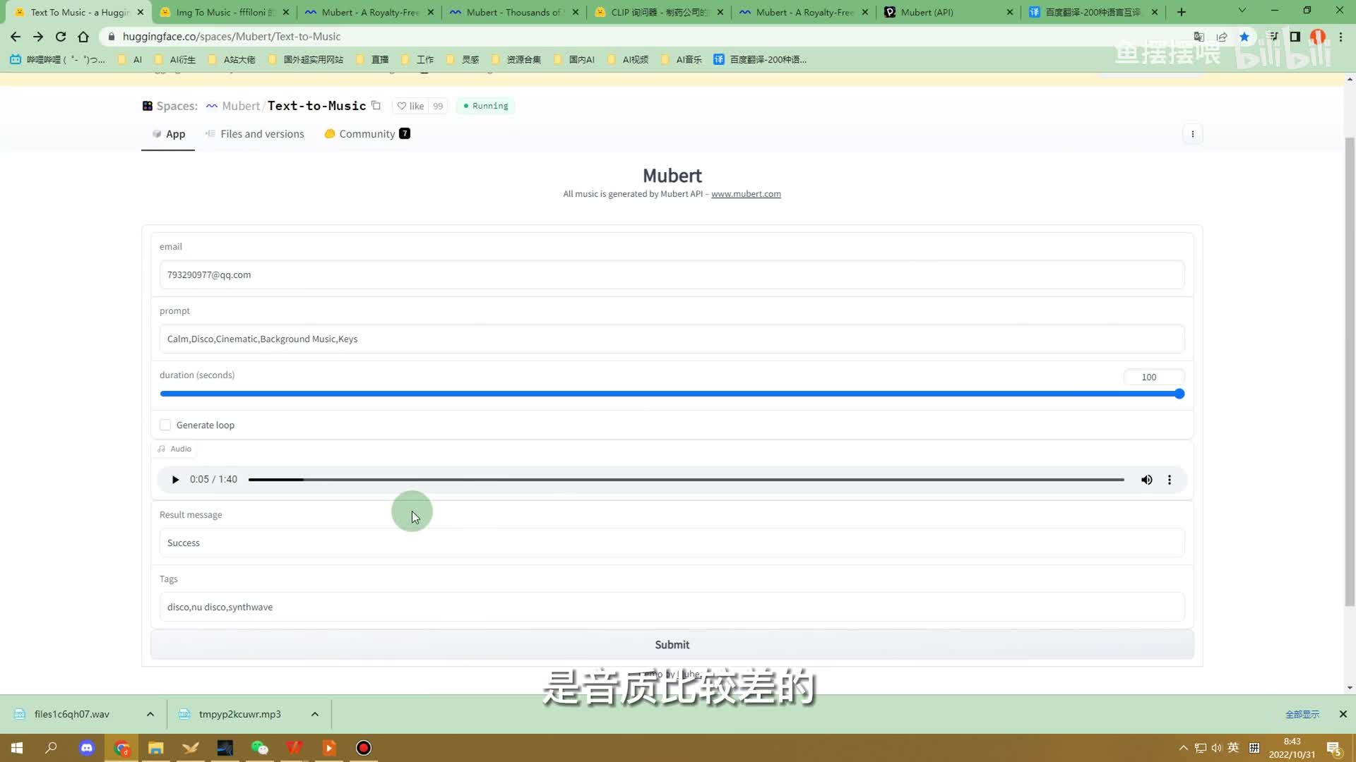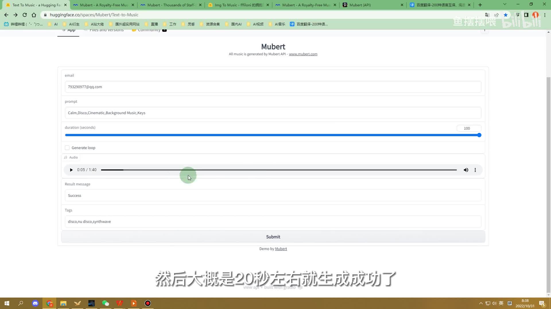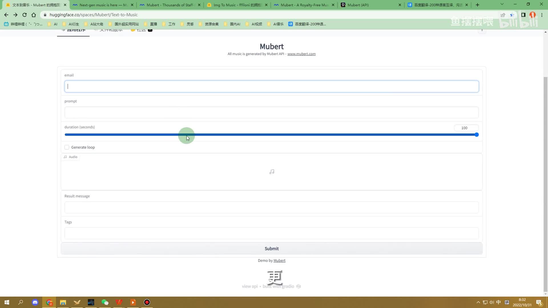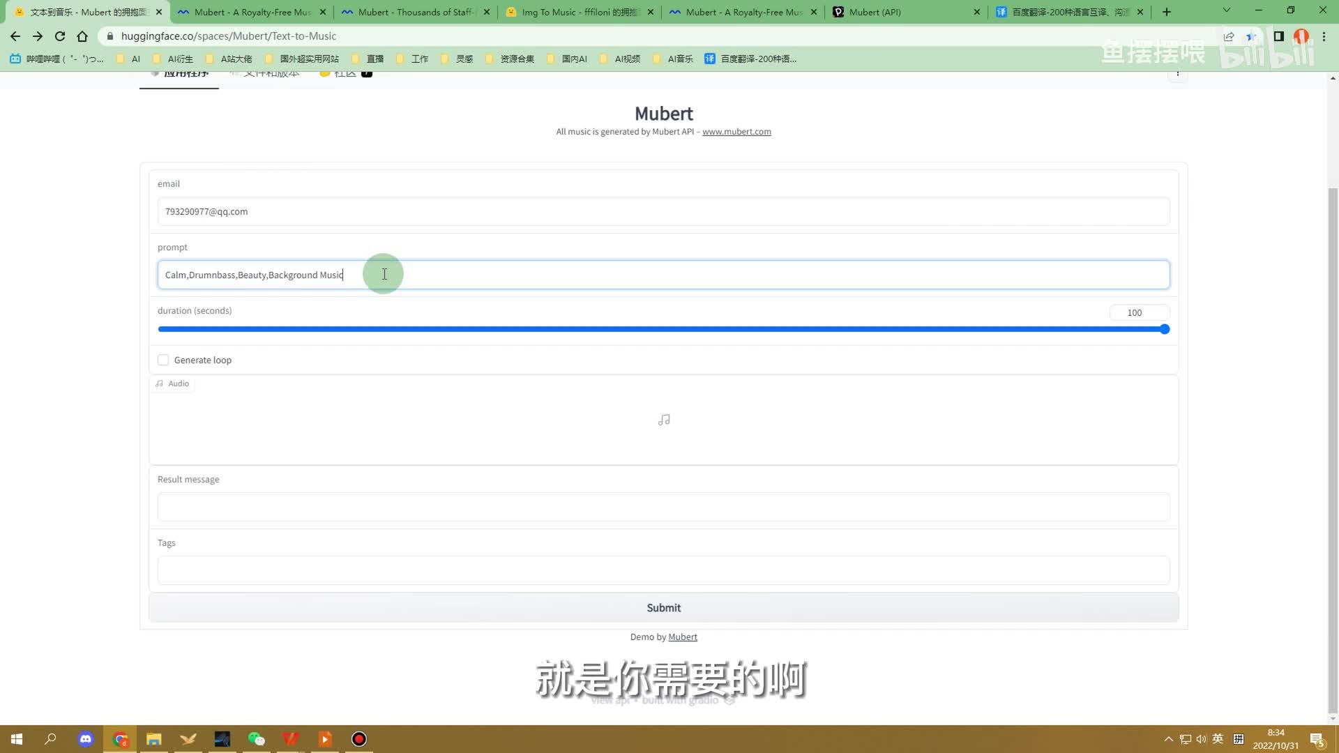 比如说背景音乐对吧?这个这样复制上去会是英文还是中文啊?哎,是中文不行。呃,background music. ok. 就是你可以把这些东西都输入进去就是你需要的。然后呢,输入完了以后呢,这里是一个选择你生成的时长。但在这里的话呢,它最多只能生成一百秒的音乐,在这个时候就已经可以了,你就可以直接点submit。直接生成,然后速度非常快啊,大概应该二十秒就会出来。