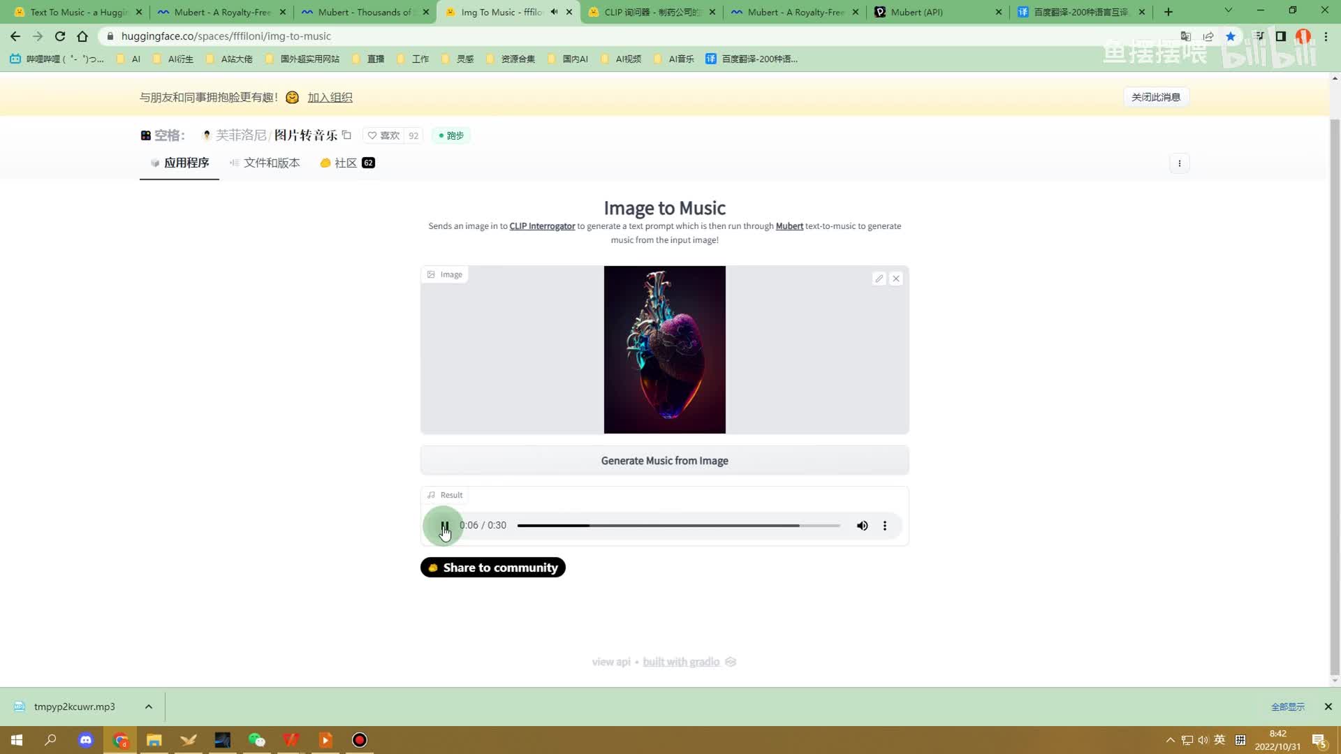 紫红色的啊等等等等,很多词还挺专业的这这个描述也写的非常专业,非常好。我们也可以通过这个程序呢去反推出描述语,然后用这个东这个描述语再去生成一张图片,看看它有什么样子的差距。那么在这个时候呢,我们的这个音乐也已经出来了。你来试听一下,我觉得还挺好听的啊,就是心脏嘛它有这种嗯心跳的这种古典这种感觉。而且呢我在录这个视频之前,我有已经试过几次了,上传这张图片。它输出的音乐也完全不一样。ok同样的我们在这里点下载就可以把这个东西下下来了。
