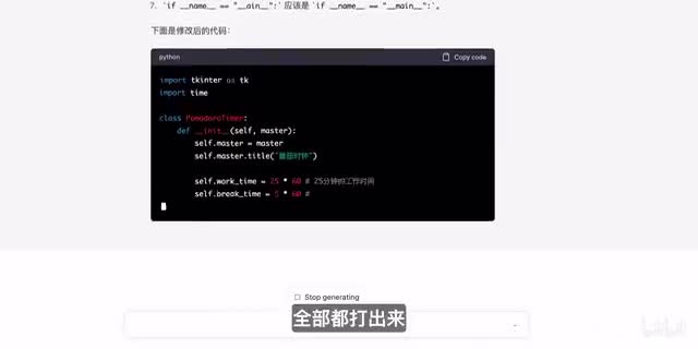 接着我们再让他把这个转变成视频文案,然后非常快,文案就这么简单的生成。内容方面虽然有些地方需要更正,但是整体的结构和逻辑方面已经非常的优秀。但是你敢想象吗?一个你喜欢的up主的稿子可能完全是由ai生成的,而作为观众的你却毫不知情。大家我sherry,今天我们来一起回顾一下那个开启智能手机时代的标志性产品,初代iphone。另外,我们还可以用它来写代码。比如这里我想让他用python编写一个带有用户界面的番茄式中小程序,它也是疯狂的输出代码,在最下方还解释了代码的基本逻辑和实现方式。