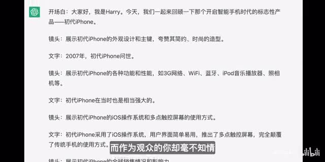 如果有这么一个强人工智能的聊天机器人和你文字聊天,即便你被告知对方是机器人,你也完全无法感受到任何它是机器人的证据。而chat g p t和new bing都暂时没有办法做到这一点,他们没有像人类一样独特的人格或者创新能力,所以目前都不能算是强人工智能。但是毫无疑问的是,chat g p t和new bing都已经开始了这方面努力。而真正让我们感受到它强大的原因是因为它不但可以。非常准确的理解我们在说的话,并且最恐怖的是他们的回复在很多情况下都十分优秀。比如这里我们让拆g p t写一篇关于初代iphone的视频文案大纲,一篇可能需要半个小时才能构思出来的视频大纲一下子就出来了。