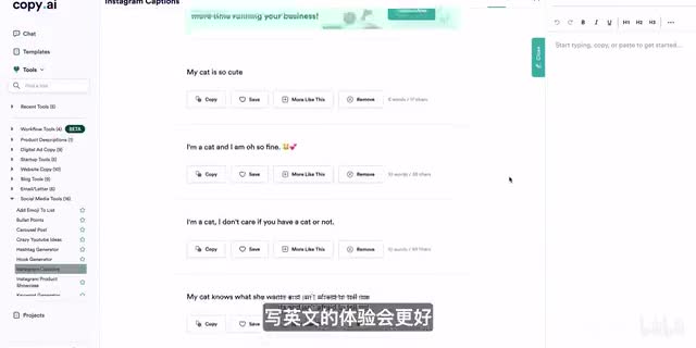 最后呢还有非常实用的网站copy到的a i这个网站可以通过你的描述生成文章、邮件、网站、博客等内容,支持中文,每个月可以免费生成两千字以内的内容,有九十多种不同的写作工具可以使用,写英文的体验会更好。如果你的工作需要写很多的文案,不妨试试这个工具。有些地方呢还是要比拆g p t更好用。好,那以上就是本期视频的全部内容了,希望对你有所启发。如果你觉得这些视频做的还不错的话,不要忘了留下一个点赞设置与关注。非常感谢大家支持我,sherry, 我们下个视频再见,拜拜。