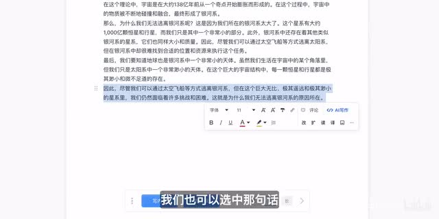 打开网站,选择新建文档,输入双斜杠,输出指令框,在这里我们可以看到超多不同的文案模板,比如方案报告、产品种草、视频文案等等,选择想要的类别,输入主题,点击发送,文案就这么光速生成了。如果你觉得有些句子表达不够到位,我们也可以选中那句话,并且在这里选择改写。我们就可以看到新的表达来替代原有的,或者选择扩写选项对原本的文案进行内容扩充。当然这个工具还有其他很多超级实用的功能,比如纠正措辞、病句a i续写文章总结文案内容等等,足够全能,非常好用。