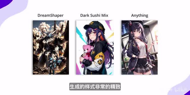 我们只需要知道,只要载入相对应的模型就可以生成类似模型中的图片。输入相同的关键词,选择不同的模型,生成的风格也是不同的。比如呢我们选择dark sushi这个模型,生成的图像风格是这样这样和这样的。又比如我们选择一个比较写实的模型,生成的风格是这样这样和这样。