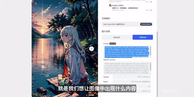 找到自己喜欢的图像,在右下角找到图片详情就可以看到线程提示词。第一个就是我们的关键词,就是我们想让图像中出现什么内容。第二个是反向。关键词,也就是我们不想让图像中出现什么内容。